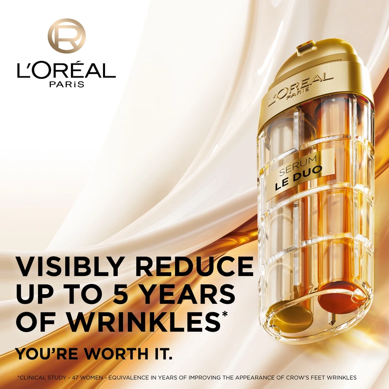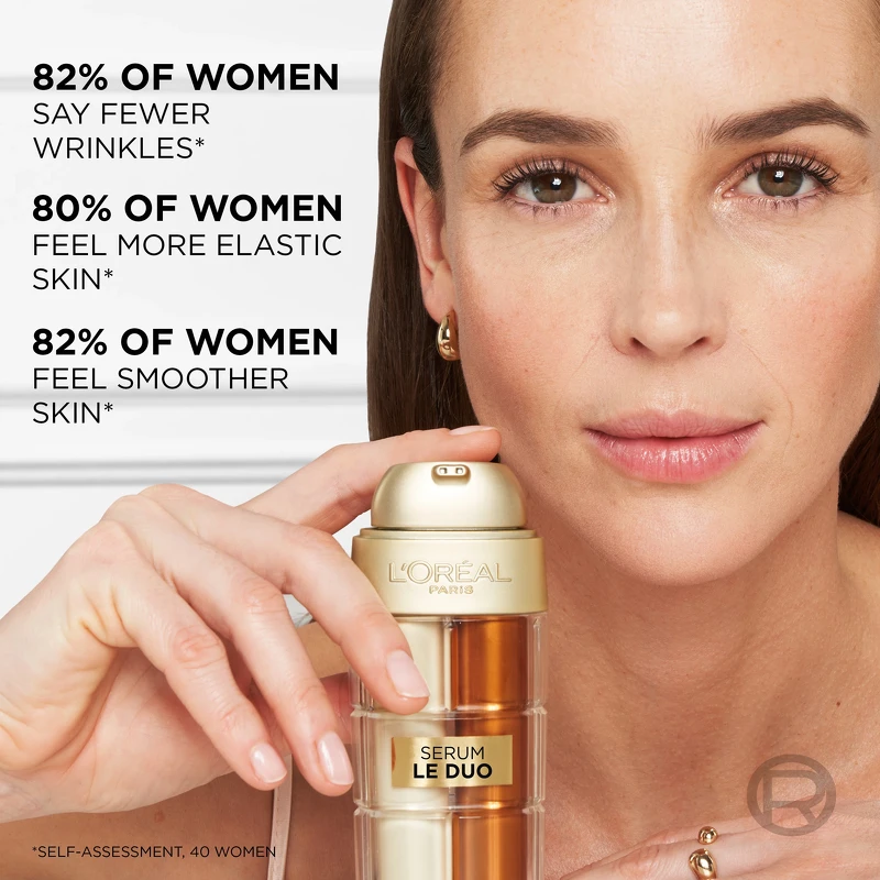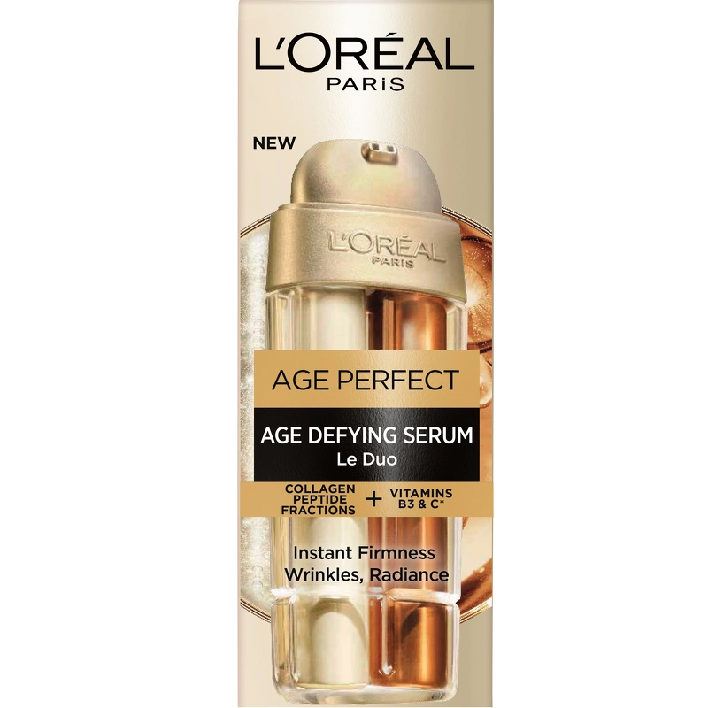 L'Oréal Paris Age Perfect Le Duo Age Defying Serum is een anti-aging serum geschikt voor alle huidtypen, inclusief de gevoelige huid. Voor het eerst combineert L'Oréal Paris de effectiviteit van twee serums in één om de tekenen van veroudering te verminderen. De twee formules zijn verdeeld over twee verschillende compartimenten om optimale frisheid in elke druppel te behouden. Een witte, voedende, fluweelzachte crème verrijkt met collageenpeptidefracties die de stevigheid van de huid verhogen. En een lichte, karamelkleurige emulsie met de essentiële vitamines C en B3, die de huid laten stralen en de teint egaliseren. Dankzij de dubbele pomp krijg je elke keer dat je het serum gebruikt een nieuwe, frisse mix van actieve ingrediënten in optimale concentratie. Het resultaat? Tekenen van veroudering op de huid verminderen in slechts 7 dagen met het effect van 2 serums in 1. Het directe effect is een gladdere, intens gevoede teint. Na 7 dagen ziet de huid er zichtbaar jonger uit, is stralender en heeft meer gedefinieerde contouren. Tekenen van veroudering lijken verminderd. Na 4 weken is de huid steviger, egaler en zijn rimpels minder zichtbaar. Het serum heeft een aangename consistentie en voelt na het aanbrengen niet vettig aan. Vitamine C-derivaat. Cosmetoklinische test, 47 vrouwen, meting van lachrimpels rond de ogen. Voordelen: - 2-in-1 serum - Vermindert tekenen van veroudering - Direct effect op stevigheid en glans - Rimpels lijken verminderd - Egaliseert de teint - Voedend - Geschikt voor alle huidtypen, inclusief de gevoelige huid - Comfortabele, niet-vette consistentie - Getest onder dermatologisch toezicht Toepassing: - Gebruik op een gereinigde huid - Aanbrengen op gezicht en hals met opwaartse bewegingen - Eindig met gezichtscrème Ingrediëntenlijst:** AQUA / WATER, GLYCERINE, ALCOHOL DENAT., DIMETHICONE, BUTYLEENGLYCOL, DIPROPYLEENGLYCOL, SILICA, CI 77891 / TITAANDIOXIDE, NIACINAMIDE, CAPRYL/CAPRIC TRIGLYCERIDE, ADENOSINE, ALANINE, ARGININE, ASPARAGINEZUUR, CALCIUM PCA, CAPRYLOYLSALICYLZUUR, KOPERGLUCONAAT, GLUCOSE, GLYCINE, HISTIDINE, ISOLEUCINE, MAGNESIUMASPARTAAT, NEOHESPERIDINE DIHYDROCHALCONE, PALMITOYL TETRAPEPTIDE-7, PALMITOYL TRIPEPTIDE-1, PCA, FENYLALANINE, PROLINE, SACCHAROMYCES CEREVISIAE EXTRACT, SERINE, NATRIUMHYALURONAAT, NATRIUMHYDROXIDE, NATRIUM-PCA, THREONINE, TRINATRIUMETHYLEENDIAMINEDISUCCINAAT, VALINE, ZINKGLUCONAAT, ASCORBYLGLUCOSIDE, PANTHENOL, TOCOFEROL, ARGANIA SPINOSA KERNELOLIE, AMMONIUMPOLYACRYLOYLDIMETHYLTAURAAT, CAPRYLYLGLYCOL, CARBOMER, CITROENZUUR, GLYCINE SOJA OLIE/SOJAOLIE, MICA, POLOXAMER 338, POLYSORBAAT 20, NATRIUMLACTAAT, TINOXIDE, 1,2-HEXAANDIOL, METHYLSILANOL/SILICAATCROSSPOLYMEER, LIMONEEN, LINALOOL, KARAMEL, FENOXYETHANOL, PARFUM/GEUR (DOSSIER Z70032488/1).