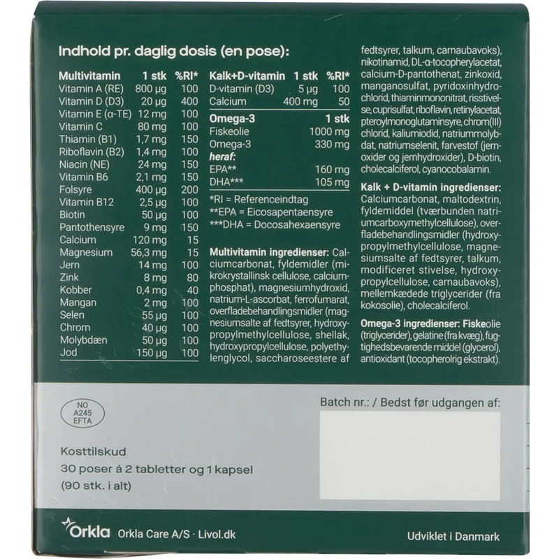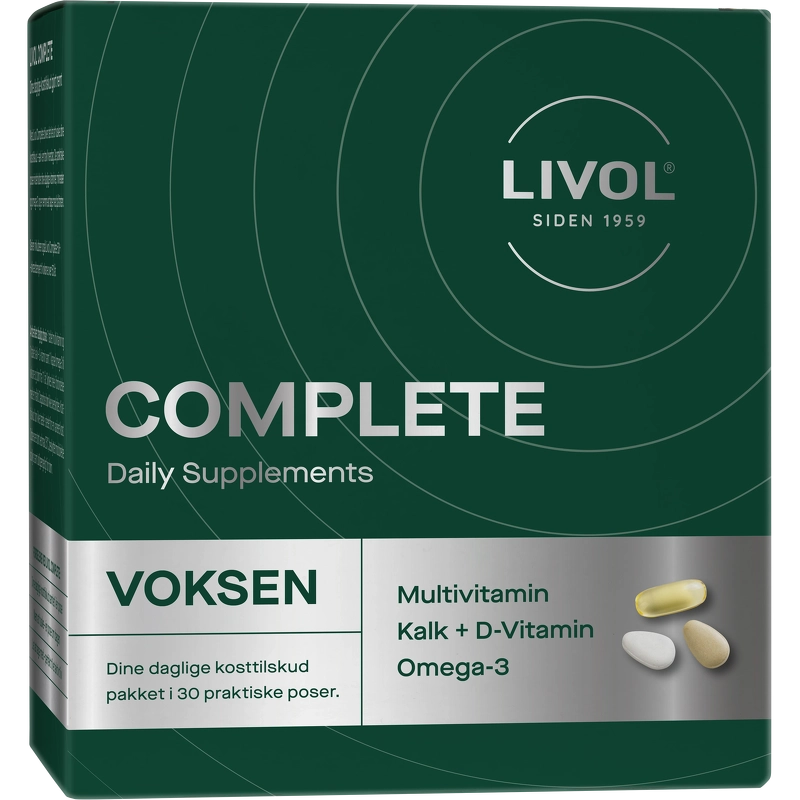 Livol Complete Daily Supplements Adult is een handige verpakking met dagzakjes die uw dagelijkse supplementen met vitaminen, mineralen en omega-3 in één handige oplossing bevatten. Zo is het gemakkelijk mee te nemen, waar u ook bent. Elk zakje bevat: 1 Multivitamine voor volwassenen met onder andere vitamine D, vitamine C en B12. Vitamine D draagt bij aan de normale werking van het immuunsysteem en het behoud van gezonde botten en spieren. Vitamine C helpt vermoeidheid te verminderen. B12 draagt bij aan een normale energiestofwisseling en de normale werking van het zenuwstelsel. Gemakkelijk te slikken tablet. 1 Calcium + Vitamine D. Calcium is essentieel voor het behoud van gezonde botten en tanden. Vitamine D draagt bij aan de normale opname en benutting van calcium. Gemakkelijk te slikken tablet. 1 Omega-3 capsule, die de belangrijke vetzuren EPA en DHA bevat. EPA en DHA dragen bij aan een normale hartfunctie (het gunstige effect wordt bereikt bij een dagelijkse inname van 250 mg). DHA draagt ook bij aan het behoud van een normale hersenfunctie en een normaal gezichtsvermogen (bij 250 mg per dag). Voordelen: - Voedingssupplement - 30 handige dagelijkse sachets - Elk sachet bevat 2 tabletten en 1 capsule - Dagelijkse aanvulling van vitaminen, mineralen en omega-3 in één complete oplossing - Gemakkelijk te onthouden en mee te nemen Aanbevolen dagelijkse dosis: - 1 tablet multivitamine en 1 tablet calcium + vitamine D plus 1 capsule omega-3 voor volwassenen en kinderen vanaf 11 jaar - In zijn geheel doorslikken tijdens een maaltijd - Bevat 30 dagelijkse sachets, goed voor 30 dagen gebruik Voedingswaarde per dagelijkse dosis (één sachet): 1 stuk Multivitamine: - Vitamine A (RE) 800 μg - Vitamine D (D3) 20 μg - Vitamine E (α-TE) 12 mg - Vitamine C 80 mg - Thiamine (B1) 1,7 mg - Riboflavine (B2) 1,4 mg - Niacine (NE) 24 mg - Vitamine B6 2,1 mg - Foliumzuur 400 μg - Vitamine B12 2,5 μg - Biotine 50 μg - Pantotheenzuur 9 mg - Calcium 120 mg - Magnesium 56,3 mg - IJzer 14 mg - Zink 8 mg - Koper 0,4 mg - Mangaan 2 mg - Selenium 55 μg - Chroom 40 μg - Molybdeen 50 μg - Jodium 150 μg 1 stuk Calcium + vitamine D: - Vitamine D (D3) 5 μg - Calcium 400 mg 1 stuk. Omega-3: - Visolie 1000 mg - Omega-3 330 mg - waarvan: - EPA (eicosapentaeenzuur) 160 mg - DHA (docosahexaeenzuur) 105 mg LET OP: Droog bewaren bij maximaal 25 °C, beschermd tegen direct zonlicht. De aanbevolen dagelijkse dosis niet overschrijden. Voedingssupplementen zijn geen vervanging voor een gevarieerde voeding. Buiten het bereik van kinderen houden. Ingrediëntenlijst: Multivitamine: Calciumcarbonaat, vulstoffen (microkristallijne cellulose, calciumfosfaat), magnesiumhydroxide, natrium-L-ascorbaat, ferrofumaraat, glansmiddelen (magnesiumzouten van vetzuren, hydroxypropylmethylcellulose, schellak, hydroxypropylcellulose, polyethyleenglycol, sucrose-esters van vetzuren, talk, carnaubawas), nicotinamide, DL-α-tocoferylacetaat, calcium-D-pantothenaat, zinkoxide, mangaansulfaat, pyridoxinehydrochloride, thiaminemononitraat, rijstzetmeel, kopersulfaat, riboflavine, retinylacetaat, pteroylmonoglutaminezuur, chroom(III)chloride, kaliumjodide, natriummolybdaat, natriumseleniet, kleurstoffen (ijzeroxiden en ijzerhydroxiden), D-biotine, cholecalciferol, cyanocobalamine. Limoen + Vitamine D: Calciumcarbonaat, maltodextrine, vulstof (verknoopte natriumcarboxymethylcellulose), glansmiddelen (hydroxypropylmethylcellulose, magnesiumzouten van vetzuren, talk, gemodificeerd zetmeel, hydroxypropylcellulose, carnaubawas), middellangeketen-triglyceriden (uit kokosolie), cholecalciferol. Omega-3: Visolie (triglyceriden), gelatine (van runderen), bevochtigingsmiddel (glycerol), antioxidant (tocoferolrijk extract).