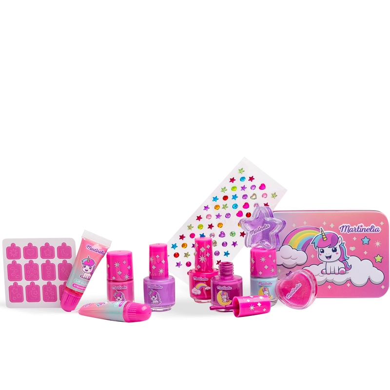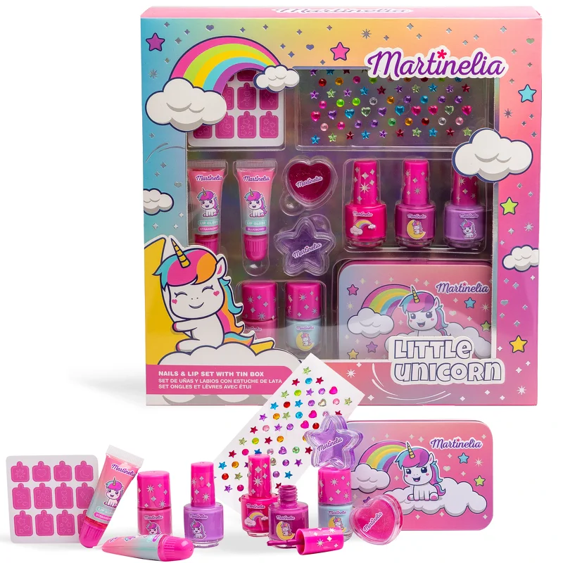 Martinelia Little Unicorn Nagel- & Lippenset met Blikken Doosje is een kleurrijke set, speciaal voor kinderen die graag hun creativiteit de vrije loop laten. De prachtige geschenkdoos bevat vijf nagellakken op waterbasis in prachtige tinten, twee lipglosses en twee kleine lipglosspotjes, waardoor je gemakkelijk met verschillende looks kunt experimenteren. Er zitten ook leuke sjablonen en leuke gezichtsstickers bij, zodat je kind zichzelf op nieuwe manieren kan versieren. Alles kan worden verzameld in het schattige blikken doosje, dat de inhoud beschermt en de set gemakkelijk mee te nemen maakt op reis. De set bevat: - 5 stuks nagellakken - 2 stuks lipgloss - 2 stuks lipglosspotjes - 1 vel Sjablonen - 1 vel Gezichtsstickers - 1 stuk Blikken doos