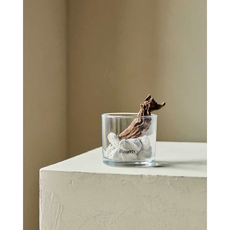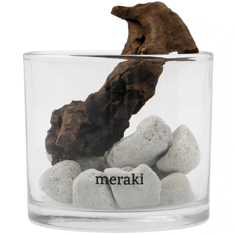 Meraki Lavastone & Wood Diffuser - Wit is een super elegante en natuurlijke diffuser met witte lavastenen en drijfhout in een helder glas. Het enige wat u hoeft te doen is een paar druppels etherische olie aan de stenen toe te voegen en de aangename geur zich te laten verspreiden. Vind Meraki's selectie van etherische oliën [hier](). Plaats de diffuser in de badkamer, woonkamer, keuken of een andere kamer waar u een mooi, decoratief element en een heerlijke geurervaring wilt toevoegen. Met deze diffuser heeft Meraki een nieuwe standaard gezet voor hoe u design en functie esthetisch kunt combineren om een warme en uitnodigende sfeer in uw huis te creëren. Omdat lavastenen en drijfhout natuurlijke materialen zijn, kunnen vormen en kleuren per product verschillen. Details: - Diffuser - Helder glas met witte lavastenen en drijfhout - Voor etherische oliën - Elegant design - Creëert een warme en uitnodigende sfeer in uw huis - Afmetingen: H: 9,2 cm, D: 10 cm