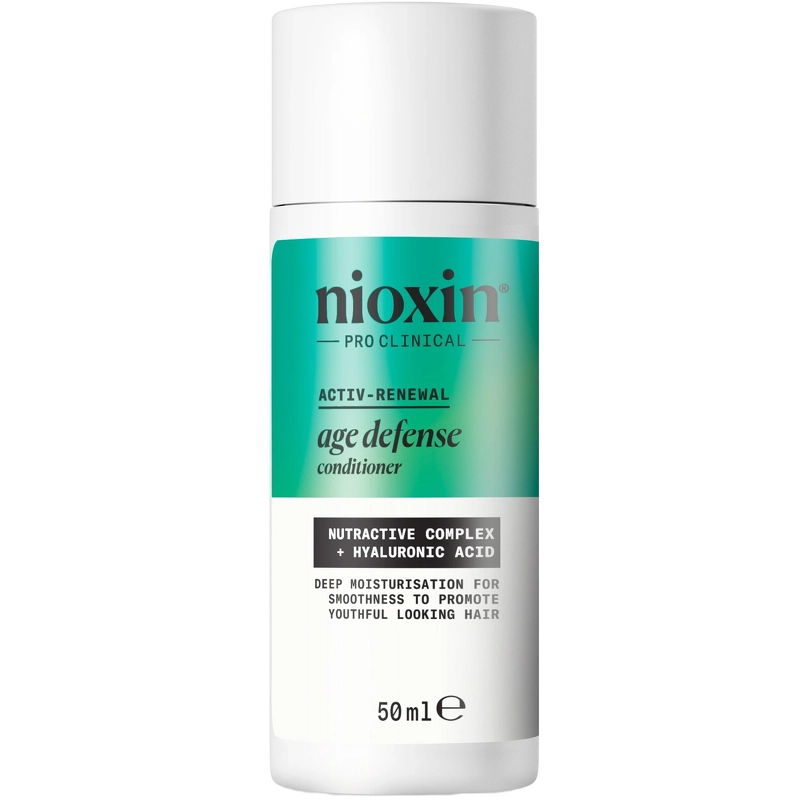Nioxin Age Defense Conditioner is een verzorgende conditioner speciaal ontwikkeld voor ouder wordend haar. Deze lichte, intens hydraterende conditioner versterkt het haar, beschermt het tegen breuk en maakt het zijdezacht van wortel tot punt. Het bestrijdt ook de droogheid en broosheid die vaak voorkomen bij ouder wordend haar. Dankzij de krachtige formule met hyaluronzuur, niacinamide en cafeïne hydrateert het zowel haar als hoofdhuid intensief. Gebruik het in combinatie met de producten uit de Nioxin Age Defense routine om de hoofdhuid te revitaliseren, de haarfollikelactiviteit te ondersteunen en de melanineproductie te bevorderen voor voller, glanzender en jeugdiger haar. De kleurveilige formule is vrij van sulfaten, siliconen en parabenen en biedt de dagelijkse hydratatie die ouder wordend haar nodig heeft, zonder het te verzwaren. Voordelen: - Conditioner - Ontwikkeld voor ouder wordend haar - Diep hydraterend - Versterkend - Verzachtend - Voorkomt droogheid en broosheid - Verzwaart het haar niet - Kleurveilig Gebruiksaanwijzing: - Verdeel gelijkmatig over haar en hoofdhuid na het wassen - Laat 3-5 minuten inwerken en spoel vervolgens grondig uit