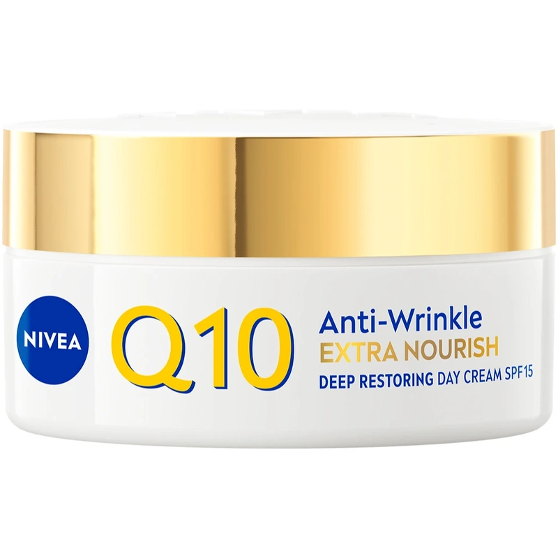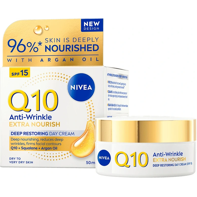 Nivea Q10 Extra Nourish Deep Restoring Day Cream SPF 15 is een dagcrème voor een zeer droge of rijpe huid die de huid intensief voedt en beschermt tegen UVA/UVB-stralen die vroegtijdige huidveroudering veroorzaken. Deze dagcrème is verrijkt met pure Q10, biologische arganolie en squalaan. Q10 verhoogt de energie van huidcellen en helpt ze efficiënt te functioneren, en corrigeert rimpels van binnenuit (getest op huidcellen). Biologische arganolie is rijk aan omega 6 en 9 en staat bekend als een hydraterend ingrediënt dat de huid kalmeert en voedt. Squalaan is een bekend hydraterend ingrediënt dat de huid beschermt tegen uitdroging en zacht maakt. Tests tonen aan dat de huid na 24 uur intensief gehydrateerd is bij 92% van de vrouwen (zelfevaluatie, 107 vrouwen, 2022). Na 2 weken is de huid elastischer en voelt steviger aan bij 86% van de vrouwen (zelfevaluatie, 107 vrouwen, 2022). Na 4 weken zijn diepe rimpels zichtbaar verminderd en zijn de gezichtscontouren en de verslapte huid strakker bij 82% van de vrouwen (zelfevaluatie, 107 vrouwen, 2022). De dagcrème is ontwikkeld met een romige formule die gemakkelijk aan te brengen is op de huid en deze zacht en glad laat aanvoelen. De crème is dermatologisch getest en geschikt voor een zeer droge of rijpe huid. Voordelen: - Dagcrème - Voor een zeer droge of rijpe huid - Met SPF 15 - Intensief hydraterend - Verzacht en voedt de huid - Vermindert diepe rimpels - Verstevigt de gezichtscontouren en de verslapte huid - Intensieve verzorging en comfort - Romige formule, gemakkelijk aan te brengen - Romige consistentie, gemakkelijk te gebruiken - Dermatologisch getest Gebruiksaanwijzing: - Aanbrengen op een gereinigde huid - Zachtjes inmasseren op gezicht en hals - 's Avonds gebruiken, bij voorkeur na een serum Ingrediëntenlijst: Aqua, Glycerine, Ethylhexylsalicylaat, C12-15 Alkylbenzoaat, Methylpropanediol, Cetearylalcohol, Butylmethoxydibenzoylmethaan, Capryl-/Caprinezuurtriglyceride, Glycerylstearaat, Glycerylstearaatcitraat, Hydroxypropylzetmeelfosfaat, Butyrospermum Parkii-boter, Fenylbenzimidazol Sulfonzuur, ubiquinon, creatine, 1-methylhydantoïne-2-imide, tocoferol, Vitis vinifera-zaadolie, Argania spinosa-pitolie, squalaan, ethylhexylglycerine, caprylylglycol, xanthaangom, bis-ethylhexyloxyfenolmethoxyfenyltriazine, trinatrium-EDTA, natriumhydroxide, fenoxyethanol, parfum.