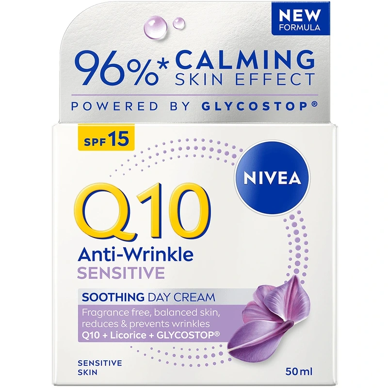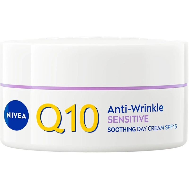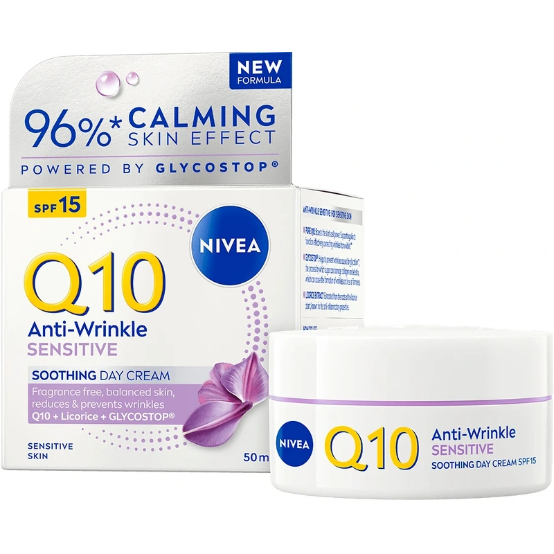 Nivea Q10 Sensitive Soothing Day Cream SPF 15 is een parfumvrije anti-aging dagcrème die in harmonie werkt met het microbioom van de huid – de eerste verdedigingslinie van de huid. Deze dagcrème bevat Q10, dat 100% huididentiek is. Q10 wordt gewonnen via een natuurlijk fermentatieproces met gist, wat een pure en natuurlijke kwaliteit garandeert die perfect samengaat met de huid. De formule vermindert zichtbaar rimpels in 4 weken en maakt de huid merkbaar steviger in slechts 2 weken. Dankzij de ontstekingsremmende eigenschappen van zoethoutwortel is de dagcrème bijzonder geschikt voor de gevoelige huid, omdat het 3 tekenen van een gevoelige huid vermindert: droogheid, een trekkerig gevoel en roodheid. De huidtolerantie van deze dagcrème is dermatologisch goedgekeurd. Geniet van een gekalmeerde, evenwichtigere en gezond uitziende huid! Voordelen: - Dagcrème - SPF 15 - Anti-aging effect - Vermindert en voorkomt rimpels en fijne lijntjes - Verstevigend - Bestrijdt droogheid, een trekkerig gevoel en roodheid - Werkt in harmonie met het microbioom van de huid - Bevordert een evenwichtige, kalme en gezonde huid - Parfumvrij - Dermatologisch getest op huidtolerantie Gebruiksaanwijzing: - Aanbrengen op een gereinigde huid - Zachtjes inmasseren op gezicht en hals - 's Avonds gebruiken, bij voorkeur na een serum Ingrediëntenlijst: Aqua, Glycerine, C12-15 Alkylbenzoaat, Methylpropanediol, Cetearylalcohol, Butylmethoxydibenzoylmethaan, Capryl-/Caprinezuurtriglyceride, Glycerylstearaat, Glycerylstearaatcitraat, Fenylbenzimidazoolsulfonzuur, Hydroxypropylzetmeelfosfaat, Butyrospermum Parkii-boter, Ubiquinon, Acetylhydroxyproline Creatine, 1-methylhydantoïne-2-imide, Glycyrrhiza inflata-wortelextract, ethylhexylglycerine, caprylylglycol, xanthaangom, bis-ethylhexyloxyfenolmethoxyfenyltriazine, trinatrium-EDTA, natriumhydroxide, fenoxyethanol.