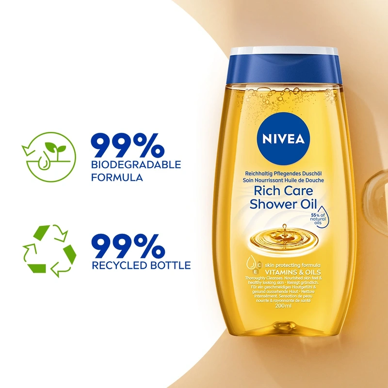 Nivea Rich Care Shower Oil is een heerlijke badolie voor de normale tot droge huid, de perfecte dagelijkse oplossing voor een gevoede en verzorgde huid. De milde formule met 55% natuurlijke oliën en vitamine E reinigt en voedt de huid, waardoor deze zacht en zijdezacht aanvoelt. Bij contact met water verandert de glanzende vloeistof in een rijk en luxueus schuim dat het lichaam omhult met een ontspannende en geurige ervaring. De formule is pH-neutraal, dermatologisch getest en 99% biologisch afbreekbaar, en bovendien vrij van microplastics. Ervaar pure verwennerij tijdens je dagelijkse doucheroutine met deze doucheolie. Voordelen: - Doucheolie - Reinigt en voedt de huid - Maakt de huid zacht en zijdezacht - Voor de normale tot droge huid - Verandert in een rijk en luxueus schuim - Heerlijke geur - pH-neutraal - Zacht voor de huid - 99% biologisch afbreekbare formule, vrij van microplastics - Dermatologisch getest Gebruik: - Aanbrengen op een natte huid onder de douche - Masseer de doucheolie in de huid tot het schuimt - Spoel grondig af met water en droog het lichaam Ingrediëntenlijst: Glycine Soja Olie, Laureth-4, MIPA-Laureth Sulfaat, Ricinus Communis Zaadolie, Parfum, Propyleenglycol, Tocoferol, Vitis Vinifera Zaadolie.