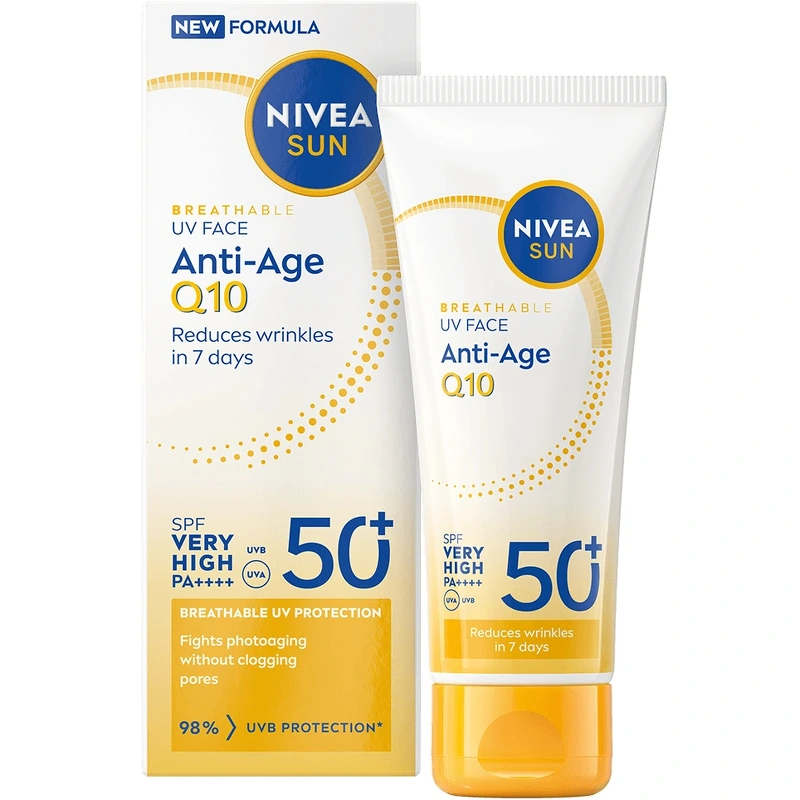 Nivea Sun UV Face Anti Age Q10 Cream SPF 50+ is een zonnebrandcrème voor de normale tot droge en gevoelige gezichtshuid die direct UV-bescherming biedt, de huid hydrateert en tekenen van veroudering tegengaat met Q10. Deze zonnebrandcrème beschermt een gezonde huid van buitenaf tegen UVA/UVB-stralen en de effecten van hoogenergetisch zichtbaar licht, zoals vroegtijdige huidveroudering. Het beschermt de huid ook van binnenuit dankzij een krachtige natuurlijke antioxidant die het eigen afweermechanisme van de huid activeert. De formule met Q10 voorkomt en bestrijdt bovendien het ontstaan van door de zon veroorzaakte fijne lijntjes, rimpels en ouderdomsvlekken. De lichte textuur zorgt voor een gehydrateerd en glad huidgevoel, zonder plakkerig gevoel, waardoor deze zonnebrandcrème ideaal is voor dagelijks gebruik. De formule is oogvriendelijk (oftewel oogvriendelijk) en dermatologisch getest op huidvriendelijkheid. Het is bovendien voor 68% biologisch afbreekbaar en respecteert de oceaan doordat het vrij is van UV-filters zoals octinoxaat, oxybenzone en octocryleen. De koker en het deksel zijn gemaakt van 50% gerecycled plastic. Het karton voor de vouwdoos is zorgvuldig geselecteerd en FSC-gecertificeerd. Voordelen: - Zonnebrandcrème voor het gezicht - Voor de normale tot droge en gevoelige huid - Zeer hoge UV-bescherming - Beschermt tegen de effecten van blauw licht - Voorkomt en bestrijdt door de zon veroorzaakte fijne lijntjes, rimpels en pigmentvlekken - Antioxidanten activeren het eigen afweermechanisme van de huid - Oogvriendelijke en Ocean Respect-formule - Lichte, niet-vette consistentie - Dermatologisch en oftalmologisch getest op huidtolerantie Gebruiksaanwijzing: - Gebruik vóór blootstelling aan de zon - Breng een royale laag gelijkmatig aan op gezicht en hals - Door minder aan te brengen, neemt de bescherming aanzienlijk af - Breng regelmatig aan, vooral na het zwemmen, transpireren of afdrogen, om optimale bescherming te behouden Ingrediëntenlijst: Aqua, Propyleenglycoldicaprylaat/dicapraat, Alcohol Denat., Butylmethoxydibenzoylmethaan, Bis-ethylhexyloxyfenolmethoxyfenyltriazine, Glycerine, Ethylhexyltriazon, Distarchfosfaat, Tapiocazetmeel, Silicadimethyl Silylaat, Undecaan, Glycerylstearaatcitraat, Fenylbenzimidazolsulfonzuur, Oryza Sativa-zetmeel, Glycerylstearaat, Diethylaminohydroxybenzoylhexylbenzoaat, Ubiquinon, Glycyrrhiza Inflata-wortelextract, Palmitoyltripeptide-5, Tocoferylacetaat, Tocoferol, Tridecaan, Stearylalcohol, Myristylmyristaat, Xanthaangom, Natriumhydroxide, Cocoglyceriden, Carrageen, Hydroxyacetofenon, Trinatrium EDTA, Fenoxyethanol, Parfum.