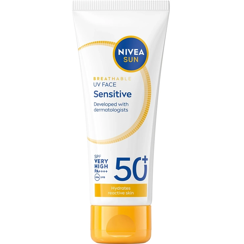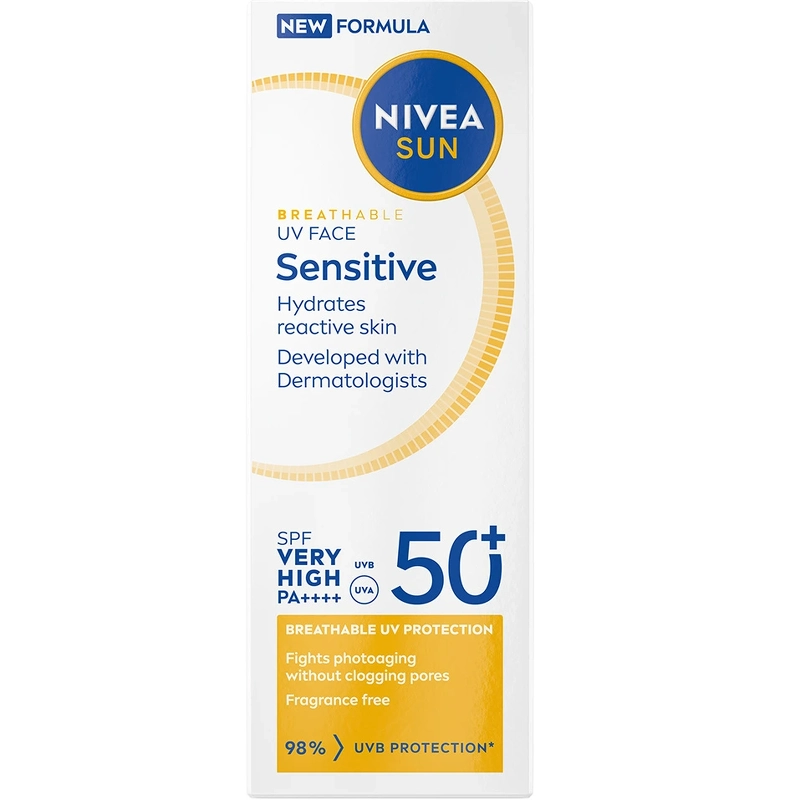 Nivea Sun UV Face Sensitive Cream SPF 50+ is een zonnebrandcrème speciaal ontwikkeld voor de gevoelige gezichtshuid. Het biedt onmiddellijke bescherming tegen door UV-straling veroorzaakte huidbeschadiging en de verzorgende, parfumvrije formule beschermt zelfs tegen zonneallergieën en kalmeert huidirritaties. Deze zonnebrandcrème beschermt een gezonde huid van buitenaf tegen UVA/UVB-stralen en tegen de effecten van hoogenergetisch zichtbaar licht (blauw licht), zoals vroegtijdige huidveroudering. Het beschermt de huid ook van binnenuit dankzij een krachtige natuurlijke antioxidant die het eigen afweermechanisme van de huid activeert. De lichte textuur zorgt voor een aangenaam huidgevoel zonder vettig aan te voelen, waardoor het ideaal is voor dagelijks gebruik. De zonnebrandcrème is ontwikkeld met een oogvriendelijke en Ocean Respect-formule en de huidtolerantie is dermatologisch en oftalmologisch bevestigd. Voordelen: - Zonnebrandcrème voor het gezicht - Voor de gevoelige huid - Zeer hoge UV-bescherming - Beschermt tegen de effecten van blauw licht - Beschermt tegen zonneallergieën - Vermindert huidirritaties - Antioxidanten activeren het eigen afweermechanisme van de huid - Oogvriendelijke en Ocean Respect-formule - Lichte, niet-vette consistentie - Parfumvrij - Dermatologisch en oftalmologisch getest op huidtolerantie Gebruiksaanwijzing: - Gebruik vóór blootstelling aan de zon - Breng een royale laag gelijkmatig aan op gezicht en hals - Door minder aan te brengen, neemt de bescherming aanzienlijk af - Breng regelmatig aan, vooral na het zwemmen, transpireren of afdrogen, om optimale bescherming te behouden Ingrediëntenlijst: Aqua, Propyleenglycoldicaprylaat/dicapraat, Alcohol Denat., Butylmethoxydibenzoylmethaan, Bis-ethylhexyloxyfenolmethoxyfenyltriazine, Glycerine, Ethylhexyltriazon, Distarchfosfaat, Tapiocazetmeel, Silicadimethylsilylaat, Undecaan, glycerylstearaatcitraat, fenylbenzimidazoolsulfonzuur, Oryza sativa-zetmeel, glycerylstearaat, diethylaminohydroxybenzoylhexylbenzoaat, methylpropaandiol, Glycyrrhiza inflata-wortelextract, panthenol, tocoferylacetaat, tocoferol, pantolacton, stearylalcohol, myristylmyristaat, xanthaangom, natriumhydroxide, cocoglyceriden, tridecaan, carrageen, citroenzuur, ethylhexylglycerine, hydroxyacetofenon, trinatrium-EDTA.
