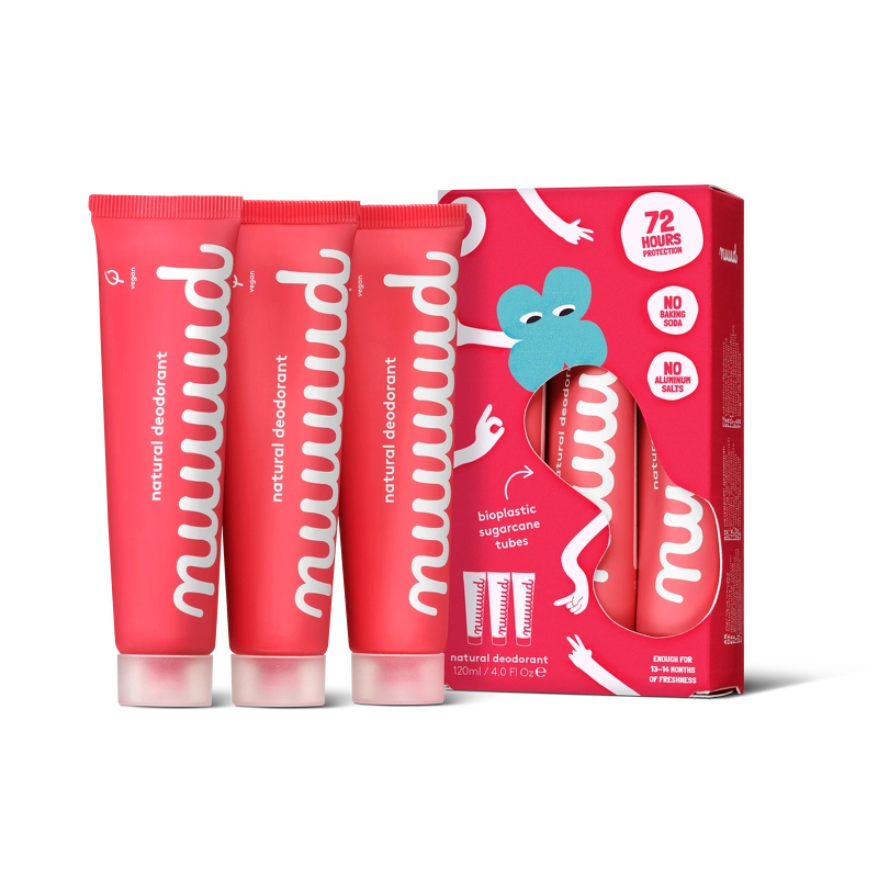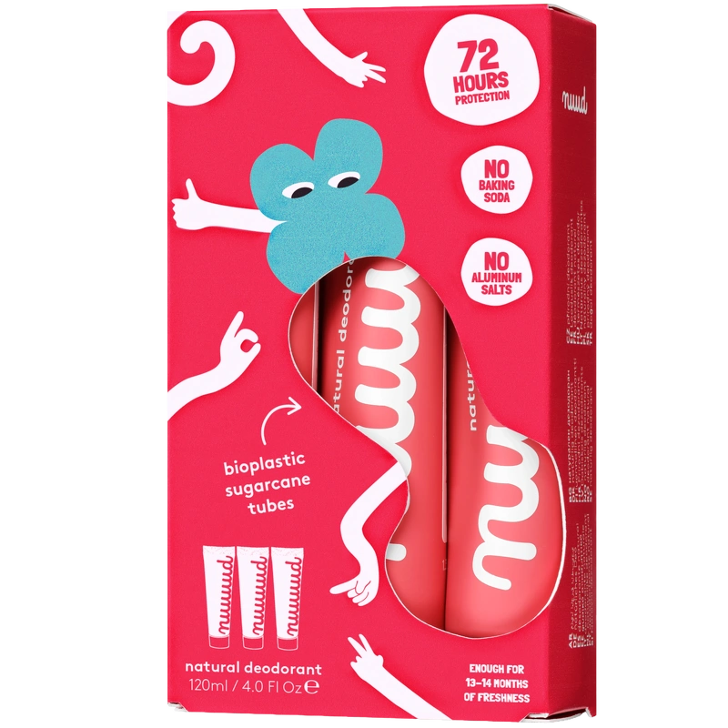 Nuud Vegan Deodorant XXL Pack is een zeer bijzondere en unieke crèmedeodorant die de geur van zweet bestrijdt, maar op een manier die jou, je omgeving en het milieu beschermt. Als jij ook graag het type bent dat jouw problemen op de meest groene manier en met een zuiver geweten kan oplossen, dan heeft Nuud jou nu de perfecte kans geboden. Hun crèmedeodorant is zonder aluminium, parabenen, chemicaliën, zout, parfum en alcohol. In plaats daarvan barst het van verzorgende, diepgaande en voedende ingrediënten zoals microzilver, kokosolie, ricinusolie, zinkoxide en amandelolie, die in combinatie met elkaar de beste combinatie zijn om slechte geurtjes te bestrijden. Dan komen we bij de verpakking. Want niet alleen de inhoud is milieuvriendelijk, ook de tube zelf en de verpakking houden rekening met onze aarde. De koker is gemaakt van suikerriet en de doos is gemaakt van biologisch afbreekbaar karton. Een geweldige crèmedeodorant die slechte bacteriën neutraliseert, de poriën niet verstopt, 3-7 dagen werkt, afhankelijk van hoeveel je zweet, niet op dieren is getest, veganistisch is en niet streept. Wij zijn er dol op, en jij waarschijnlijk ook. Voordelen: - Crèmedeodorant - Verpakking van 3 x 40 ml, komt overeen met 60 weken gebruik - Bestrijdt zweetgeur zonder de poriën te verstoppen - Zonder aluminium, parabenen, chemicaliën, zout, parfum en alcohol - Met verzorgende en voedende ingrediënten - Gaat 3-7 dagen per keer mee - Biologisch afbreekbaar karton - De tube is ontwikkeld in suikerriet - Neutraliseert slechte bacteriën - Veganistisch - Laat geen strepen achter - Verbergt de geur van zweet niet, maar voorkomt dit Gebruik: - Allereerst zul je, als je het voor de eerste keer gebruikt, voelen hoe de geur van je oksels verandert, en dit komt omdat je lichaam begint te ontgiften en bacteriën uitscheidt - Leer dan ken uw routine en ontdek na verloop van tijd hoeveel dagen er kunnen verstrijken tussen het gebruik van de deodorant. 2-3 dagen, voor sommigen meer en voor anderen minder - Gebruik slechts een kleine hoeveelheid product per keer, ter grootte van een kleine erwt - In de verpakking vind je zelfs een klein cirkeltje op het karton, dat is ca. 2-3 dagen. komt overeen met de hoeveelheid die je nodig hebt - Het product is super geconcentreerd en gaat 6-7 weken mee Ingrediëntenlijst: Zonnebloem (Helianthus Annuus) Zaadolie, Aardbei (Fragaria Ananassa) Zaadolie, Zinkoxide, Candelillawas (Euphorbia) Cerifera Cera), Pijlwortel (Maranta Arundinacea Wortel) Poeder, Tocoferol, Zilver