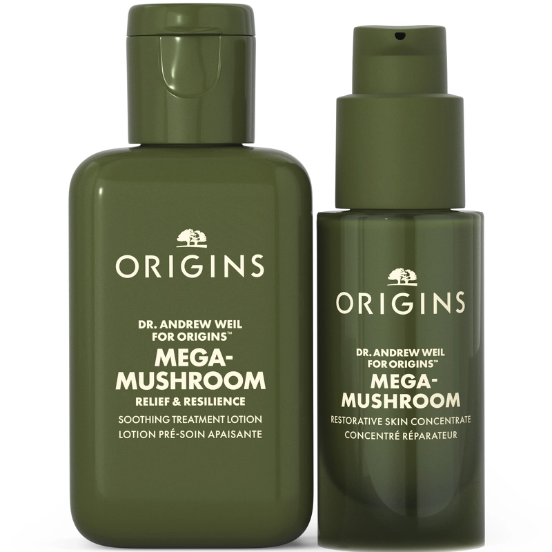 Origins Mega-Mushroom™ Calming Essentials Gift Set (Limited Edition) is een veganistische geschenkset met 2 van Origins' bestverkochte huidverzorgingsproducten, perfect voor de gevoelige huid. Geef deze kerst rust met dit verzachtende duo. Soothing Treatment Lotion hydrateert en helpt de huidbarrière te herstellen en beschermen door deze te versterken. Restorative Skin Concentrate verlicht snel zichtbare roodheid en helpt een beschadigde barrière met 480% te herstellen binnen 2 uur na de behandeling. Klinische test bij 26 vrouwen die MMRSC eenmaal gebruikten, vergeleken met een onbehandelde controlegroep na een 50% glycolzuurpeeling na twee uur, vergeleken met een onbehandelde controlegroep. De set bevat: - 1 st. Origins Dr. Weil Mega-Mushroom™ Relief & Resilience Soothing Treatment Lotion 100 ml - 1 st. Origins Dr. Weil Mega-Mushroom Restorative Skin Concentrate 30 ml