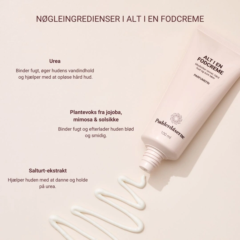 De All In One Voetcrème in poedervorm is een heerlijke voetcrème die vijf actieve ingrediënten combineert die samen de harde, droge en gebarsten huid verzachten en verminderen. Dagelijks gebruik voorkomt de vorming van eelt. ALL IN ONE Voetcrème is niet vet en laat zich gemakkelijk inmasseren. ALL IN ONE Voetcrème vermindert de geur van zure tenen. Voordelen: - Voetcrème - Goed voor droge en gebarsten hielen - Goed voor eelt - Voorkomt zure tenen - Lichte consistentie - Geurvrij Gebruik: - Gebruik ALL IN ONE Voetcrème tweemaal daags of naar behoefte. Als u eelt op uw voeten heeft, is het extra belangrijk om 's ochtends voetcrème te gebruiken om uw voeten te beschermen tegen druk en slijtage. Ingrediëntenlijst: Aqua. Urea. Ethylhexyl Stearate. Glycerin. Butyrospermum Parkii Butter. Caprylic/Capric Triglyceride. Coco-Caprylate/Caprate. Hydrolyzed Jojoba Esters. Cetylalcohol. Glycerylstearaat. Alcohol. Helianthus Annuus-zaadolie. Cetearylalcohol. Acacia Decurrens-bloemextract. Onopordum Acanthium-bloem-/blad-/stengelextract. Salicornia Herbacea-extract. Octenidine HCl. PEG-75-stearaat. Propyleenglycol. Steareth-20. Ceteth-20. Acrylaten/vinylisodecanoaat-crosspolymeer. Polyglycerine-3. Ethylhexylglycerine. Fenoxyethanol. Benzoëzuur. Dehydroazijnzuur. Natriumhydroxide.