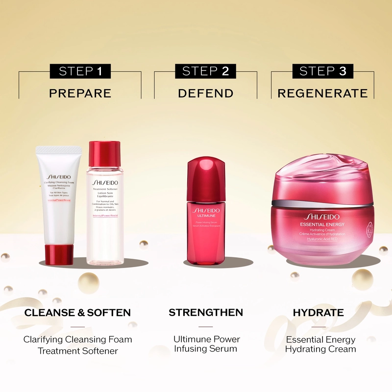 Shiseido XMAS Essential Energy Gift Set is een superlekkere en effectieve geschenkdoos. Met deze set krijg je een aantal van de populairste producten van Shiseido. Shiseido Essential Energy Hydrating Cream is een hydraterende dag- en nachtcrème die de huid de hele dag de hydratatie geeft die ze nodig heeft. De gezichtscrème bevat rood hyaluronzuur, dat de bloedcirculatie verbetert, en gezuiverd hyaluronzuur, dat de hydratatie verhoogt en dieper in de huid doordringt. Geschikt voor alle huidtypen, inclusief de gevoelige huid. In de geschenkdoos vind je ook een reiniger, een verzachter en Ultimune, onderdeel van de "Japanse Beauty" routine. Dprep Clarifying Foam is een romige schuimreiniger met effectieve ingrediënten die zorgt voor een helderdere huid met een stralende gloed. Reinigt, hydrateert en balanceert de huid diep en bereidt deze voor op verdere huidverzorging. Geschikt voor alle huidtypen. Kan 's ochtends en/of 's avonds gebruikt worden. Verwijder onzuiverheden voordat je de verzachter aanbrengt als volgende stap in je huidverzorgingsroutine. Ultimune is een anti-aging serum met camelia-extracten voor maximale huidvoordelen. Dit serum is ontwikkeld voor alle huidtypen, zelfs de gevoelige huid. De set bevat: - 1 stuk Shiseido Essential Energy Hydrating Cream - 1 stuk Shiseido Clarifying Cleansing Foam All Skin Types - 1 stuk Shiseido Ultimune Power Infusing Concentrate - 1 stuk Shiseido Treatment Softener Lotion voor de normale, gecombineerde tot vette huid