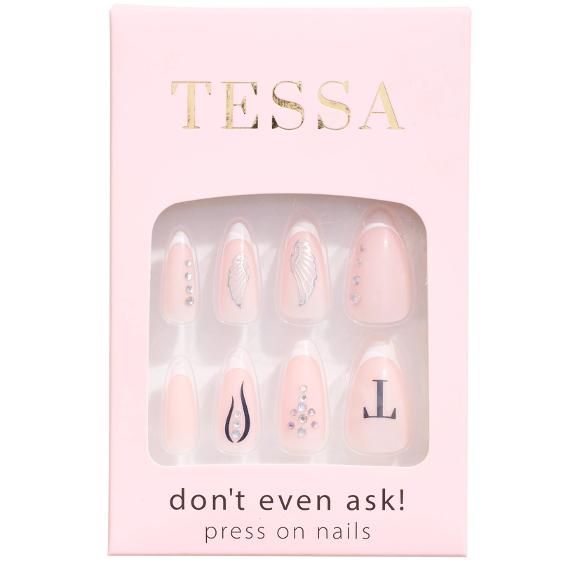 Tessa Beauty Don't Even Ask Press On Nails zijn langdurige plaknagels waarmee je je eigen unieke nagels kunt creëren. Perfect voor dagelijks gebruik, speciale gelegenheden en momenten waarop je handen voor zich spreken. Citaat van Tessa: "Ben je klaar om de beste van de slechtste te zijn? Vraag het niet eens, maar probeer deze plaknagels en creëer je eigen persoonlijke stijl. Of je nu uit de stad of van het dorp komt, met vleugels, strass-steentjes of een natuurlijke French manicure, creëer je eigen combinatie – of het nu gaat om ambitie of liefde. In de verpakking vind je een vijl en een sterke lijm, zodat je nagels langer meegaan dan wegwerpnagels." Voordelen: - 24 plaknagels in verschillende maten - Diverse designs: vleugels, strass-steentjes en French manicure - Gemakkelijk aan te brengen - Langdurig - Nagellijm en vijl meegeleverd Gebruik: - Breng altijd aan op schone, droge nagels - Gebruik een nagelbuffer om je nagels grondig te reinigen - Kies de maat die het beste bij je nagels past - Breng de lijm aan op zowel de kunstnagel als je natuurlijke nagel - Een klein druppeltje is voldoende - Breng de lijm vervolgens aan op de nagel - Begin door de nagel zo dicht mogelijk bij de nagelriem te plaatsen en zorg ervoor dat deze recht blijft - Druk ongeveer 30 seconden stevig aan. We raden aan om het eerste uur na het aanbrengen contact met water te vermijden. Verwijderen: - Week je nagels 5-15 minuten in warm zeepsop - Maak de nagel voorzichtig los en til hem aan de zijkanten op - Om mogelijke beschadiging te voorkomen, forceer je kunstnagels nooit om te verwijderen.