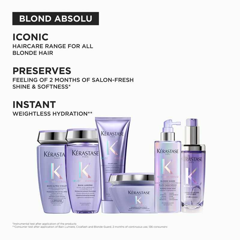Kérastase Blond Absolu Bain Ultra-Violet Shampoo er en helt fantastisk og luksuriøs sølvsjampo, som med sin unike formel er sprengt med fiolette pigmenter, penetrerer og eliminerer gylne toner, og etterlater håret med en vakker, kald farge. I tillegg er Kérastase Blond Absolu Bain Ultra-Violet Shampoo laget med effekten av edelweissblomsten og hyaluronsyre, som gir intens beskyttelse og fukt til håret. Kombinasjonen av disse ingrediensene og de lilla pigmentene utgjør en helt eksepsjonell formel som får frem det absolutt vakreste i lyst hår. Kérastase Blond Absolu Bain Ultra-Violet Shampoo etterlater håret med klarhet, farge og mykhet som aldri før! Fordel: - Sølv sjampo - Anbefalt for blondt, lyst eller grått hår - Sprengt med fiolette pigmenter - Eliminerer gylne toner - Vakker, kul farge - Laget med effekten fra edelweissblomsten og hyaluronsyre - Fuktighetsgivende og beskyttende - Unik kombinasjon av ingredienser – Får frem det vakreste i lyst hår - Skaper en klarere hårfarge - Gjør håret silkemykt Applikasjon: - Fordel sjampoen i fuktig hår – Resultatet avhenger av hvor lett og porøst håret ditt er, samt hvor lenge sjampoen sitter i - Masser grundig inn og la det sitte i ca. 2 minutter - Skyll håret grundig med vann - Gjenta om nødvendig Ingrediensliste: AQUA / WATER, SODIUM LAURETH SULFATE, COCO-BETAINE, GLYCOL DISTEARATE, SODIUM CHLORID, COCAMIDE MIPA, DIMETHICONE, SIRONSYRE, NATRIUMBENZOAT, NATRIUMHYDROKSID, HEXYLENGLYCOL, CI 407VILICON, ACID, 607, 307, 30, 3, 3 Hydroksypropyltrimonium hydrolysert hveteprotein, glyserin, magnesiumacetat, natriumhyaluronat, tocoferol, aspartisk bløt/stem -flød/fløytisk pyntol, og glutamisk, blødel, blødel, blødel, blød, blød,. /STAMEKSTRAKT, FUMARSYRE, KALIUMSORBAT, PARFUME / DUFT (FIL Z287854/2).