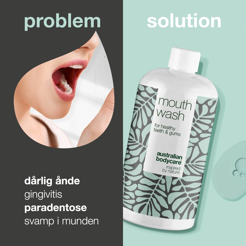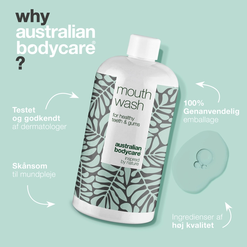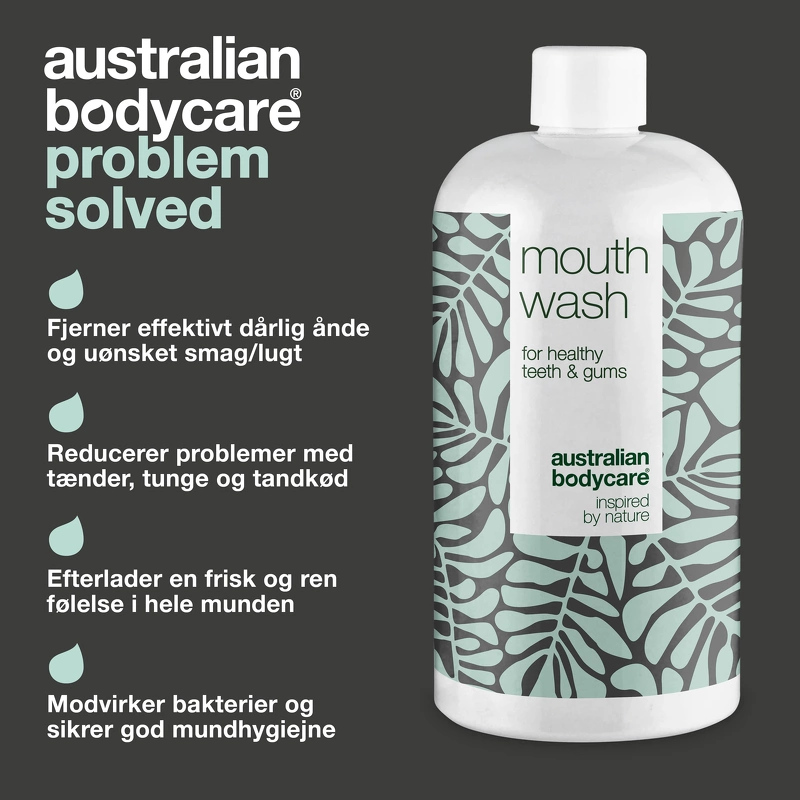 Australian Bodycare Mouth Wash er en flaske munnvann mot dårlig ånde, gingivitt, sopp og periodontitt. Dette munnvannet er med Tea Tree Oil, som motvirker bakteriene som kan forårsake vond lukt , og gir en sunn munnhygiene . Den har en pleiende og lindrende mot et sårt tannkjøtt som blør , og kan også brukes til daglig pleie mot sopp på tungen og periodontitt. Munnen etterlates med en frisk og ren følelse etter bruk. Du bør alltid pusse tennene to ganger om dagen med tannkrem selv om du bruker munnvann. I tillegg anbefales det at du bruker dette munnvannet to ganger om dagen og at det IKKE er før eller etter tannpuss. Bruk heller munnvannet på et annet tidspunkt på dagen når du føler behov for å friske opp munnen, som f.eks. etter lunsj. Hvis du sliter med tannkjøttproblemer, dårlig ånde eller sårt tannkjøtt, så er Australian Bodycare Mouth Was det rette valget for deg! Fordel: - Munnvann - Gir bedre munnhygiene - Motvirker dårlig ånde - Fjerner gingivitt, sopp og periodontitt - Virker pleiende og beroligende - God mot blødninger og vondt tannkjøtt - Gir en ren og frisk følelse - Dermatologisk testet - Vegansk Applikasjon: – Det anbefales å bruke munnvannet to ganger daglig - Munnvannet skal IKKE brukes i forbindelse med tannbørsting Ingrediensliste: Aqua/vann, sorbitol, PEG-40 hydrogenert ricinusolje, polysorbat 60, betain, melaleuca alternifolia (tea tree) bladolje, kaprylglykol, dipropylenglykol, glyserolkaprylat, allantoin, tokoferol, leptospermum/aroma bragen, leptospermum/aromasmak , Limonene.