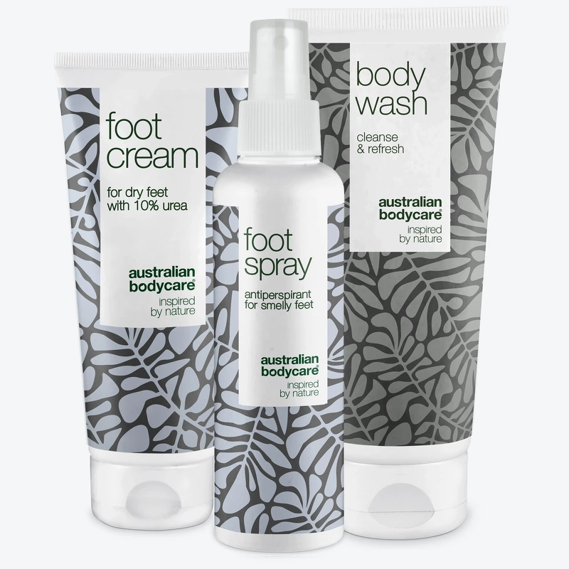 Australian Bodycare 3 Step Foot Care er en kombinasjonspakke med 3 effektive produkter for daglig pleie av føttene dine, som bidrar til å holde dem rene, luktfrie og i optimal fuktighetsbalanse. Hvis du lider av såre tær, er det viktig å vaske føttene daglig. På denne måten fjerner og forebygger du bakterier og svette, som oftest er årsaken til sure tær. Den sure lukten oppstår når svetten på føttene blandes med bakteriene på huden din. Med gode vaske- og stellrutiner kan du bli kvitt den vonde lukten. Produktene er bl.a. beriket med naturlig Tea Tree Oil, som i tillegg til den antibakterielle effekten også motvirker den ubehagelige lukten fra sure tær. Body Wash, som kan brukes både til å vaske føttene og resten av kroppen, er effektivt mot bakterier og vond lukt, men samtidig skånsomt og passer for alle hudtyper. Fotspray holder føttene tørre og fri for vond lukt i løpet av dagen. Antiperspiranten motvirker og forebygger sure tær, da den hemmer svetteproduksjonen, som er en medvirkende årsak til dårlig lukt. Sprayen kan også brukes til å kjøle ned slitne og tunge føtter og som en forfriskende skospray for stinkende sko og støvler. Fotkremen er basert på naturlig Tea Tree Oil og Urea 10% (karbamid), som sørger for at huden holdes motstandsdyktig mot bakterier og vond lukt. Samtidig sørger fotkremen (ved daglig bruk) for at huden på føttene ikke tørker ut og forblir myk og velstelt. Esken inneholder: - Australian Bodycare Body Wash 200 ml - [Australian Bodycare Foot Spray 150 ml](/australian-bodycare-foot- spray -150-ml.html) - Australian Bodycare Foot Cream 100 ml