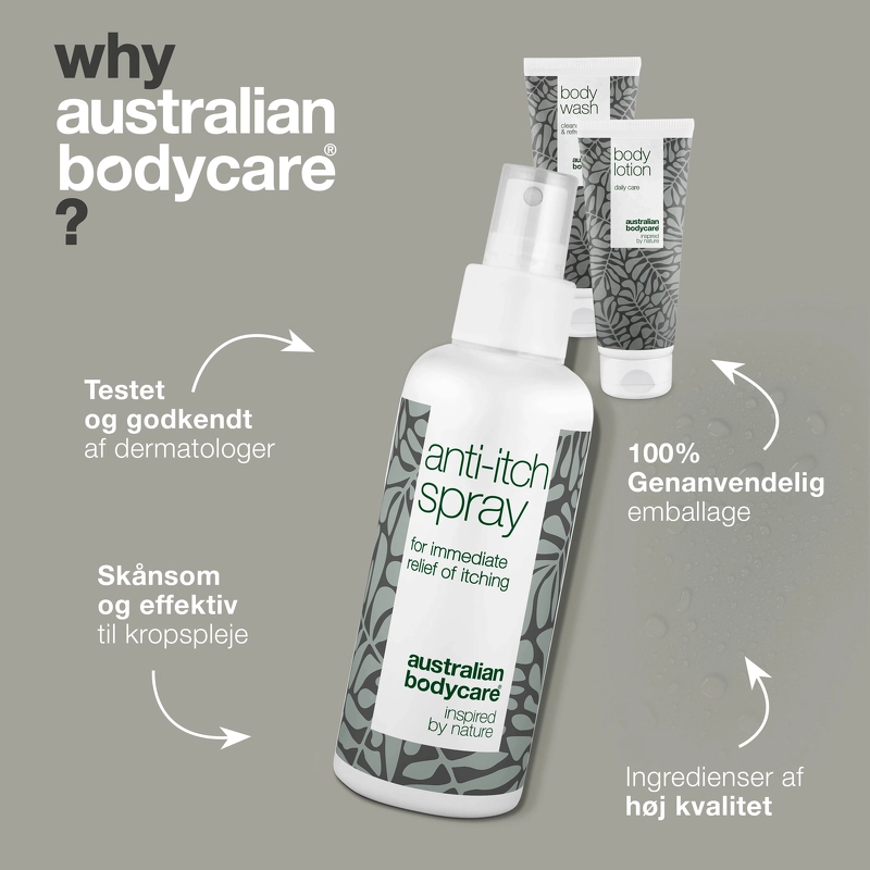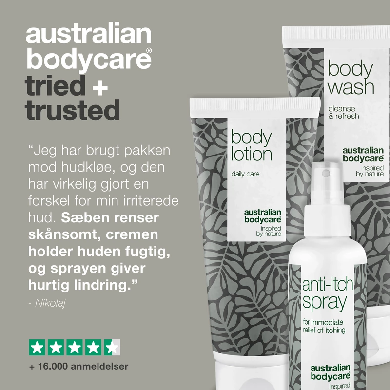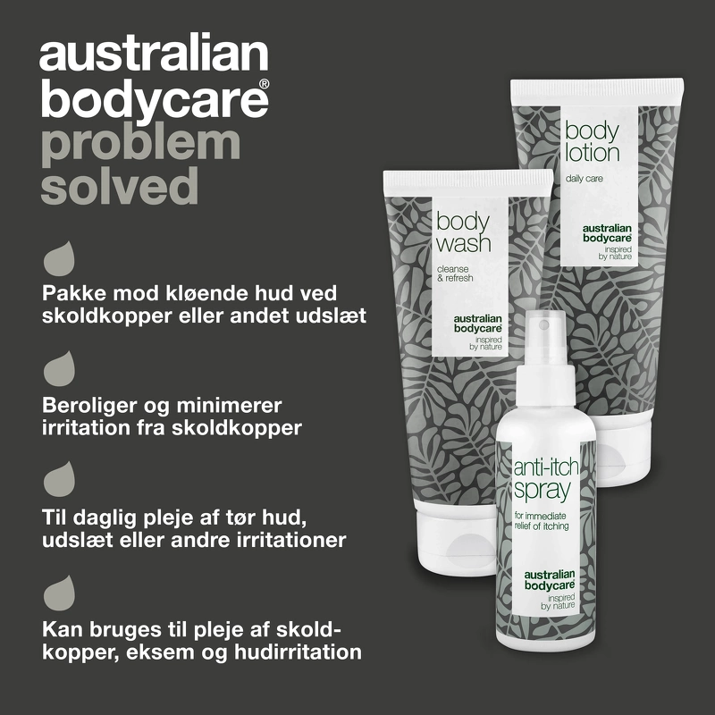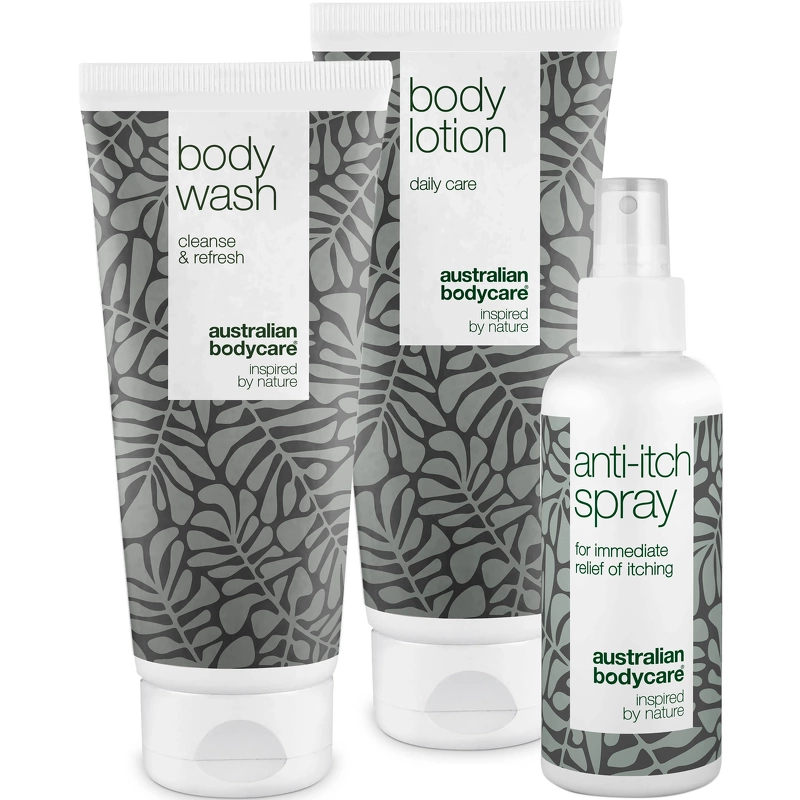 Australian Bodycare Anti-Itching Body Kit er et sett med 3 deilige produkter, som er perfekt for deg som lider av tørr og kløende hud. Australian Bodycare Anti-Itching Body Kit består av en body wash, body lotion og anti-kløe spray, som skånsomt, men effektivt renser og pleier huden, samt demper irritasjon og kløe. Alle 3 produktene inneholder Australian Tea Tree Oil, som er kjent for sine antibakterielle og kløebeskyttende egenskaper, og kan brukes på daglig basis. Få hjelp til å gjøre huden din mer rolig og velstelt med dette fantastiske australske kroppspleiesettet mot kløe. Settet inneholder: - 1 stk. Australian Bodycare Body Wash 200 ml - 1 stk. Australian Bodycare Body Lotion 200 ml - 1 stk. Australian Bodycare Anti Itch Spray 100 ml