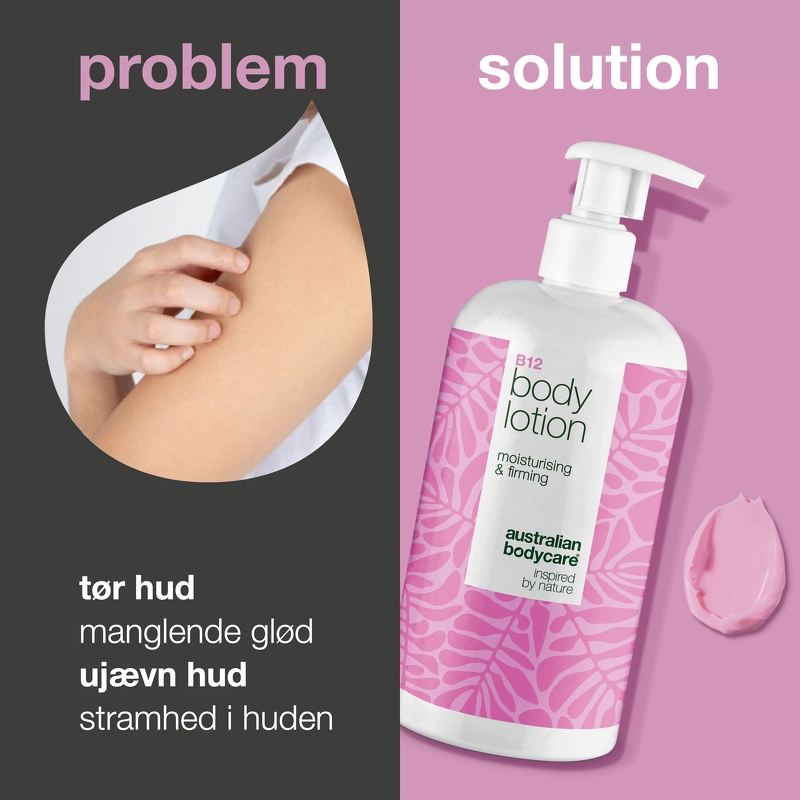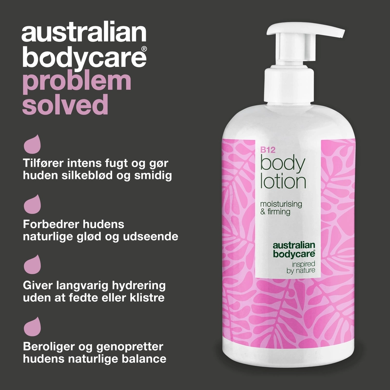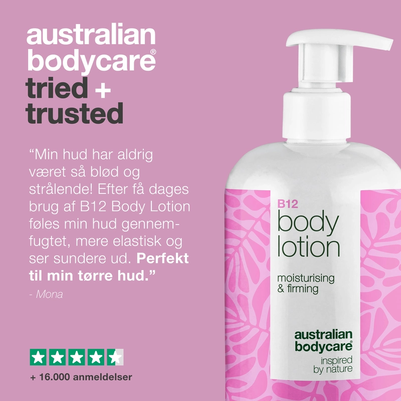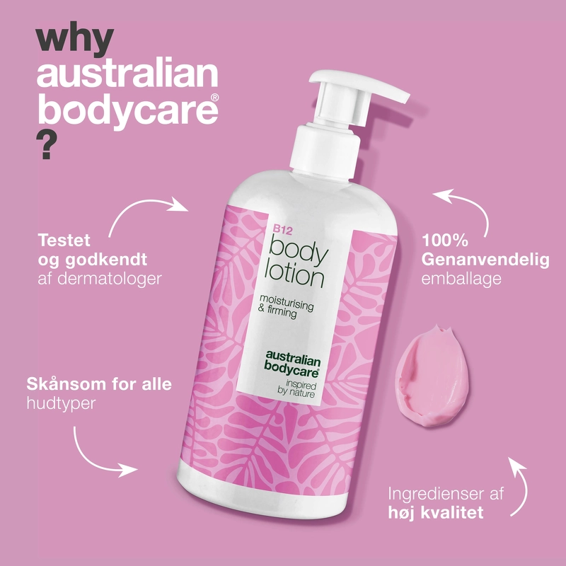 Australian Bodycare B12 Body Lotion er en bodylotion som er spesielt utviklet for de som ønsker en ikke-fet, raskt absorberende bodylotion som tilfører dyp fuktighet og bidrar til å gjenopprette hudens naturlige glød og elastisitet. Med sin kremete, men lette tekstur blir huden silkemyk og velstelt – uten den fete følelsen. Enten du har tørr eller sensitiv hud, er denne bodylotionen ideell for daglig bruk og etterlater huden både smidig og glatt. Kremen er fullpakket med aktive ingredienser som virker dypt ned for å forbedre hudens tilstand. Vitamin B12 er kjent for sine anti-aldringsegenskaper, som bidrar til å opprettholde en sunn hudtone og beskytte mot tidlige aldringstegn. Niacinamid støtter hudens fuktighetsbarriere og bidrar til en jevnere hudtone, mens urea har en intensiv fuktighetsgivende effekt og hjelper huden med å holde på fuktigheten lenger. Fordeler: - Bodylotion - Gir dyptvirkende fuktighet til huden, slik at den føles myk og næret hele dagen lang. - Ikke-fet og absorberes raskt - Støtter hudens elastisitet - Passer for alle hudtyper Bruk: - 1. Rens huden: Sørg for ren hud - eksfolier med B12 kroppsskrubb for optimal effekt. - 2. Påfør lotionen: Masser forsiktig inn i huden, spesielt på tørre områder som albuer, knær og leggben. - 3. Bruk daglig: Bruk morgen og/eller kveld for fuktet, myk hud. - Tips: Påfør rett etter bading for å forsegle fuktigheten og oppnå ekstra smidighet. For å få mest mulig ut av B12 kroppslotionen din, anbefaler vi å bruke den sammen med andre produkter fra Australian Bodycare, for eksempel vår B12 kroppsskrubb, som skånsomt eksfolierer huden og forbereder den for optimal fuktighetsopptak. Ingrediensliste: Vann Kapryl-/kaprintriglyserid Glyserin Hydrogenert etylheksylolivat Pentaerytrityldistearat Glyserylstearatsitrat Niacinamid Kapryl-/kaprint-/ravsyretriglyserid Hydrogenert olivenolje, uforsåpbare stoffer Glyserylstearat Palmitoyltripeptid-5 Cyanokobalamin Bisabolol Tokoferol Cetearylalkohol Xantangummi Solsikkefrøolje (Helianthus Annuus) Kaprylylglykol Polyakrylatkrysspolymer-6 Fenoksyetanol Parfyme/duft Melkesyre Karnosinsyre Lavandulaolje/-ekstrakt Linalool Linalylacetat * Santalol.