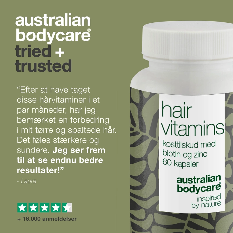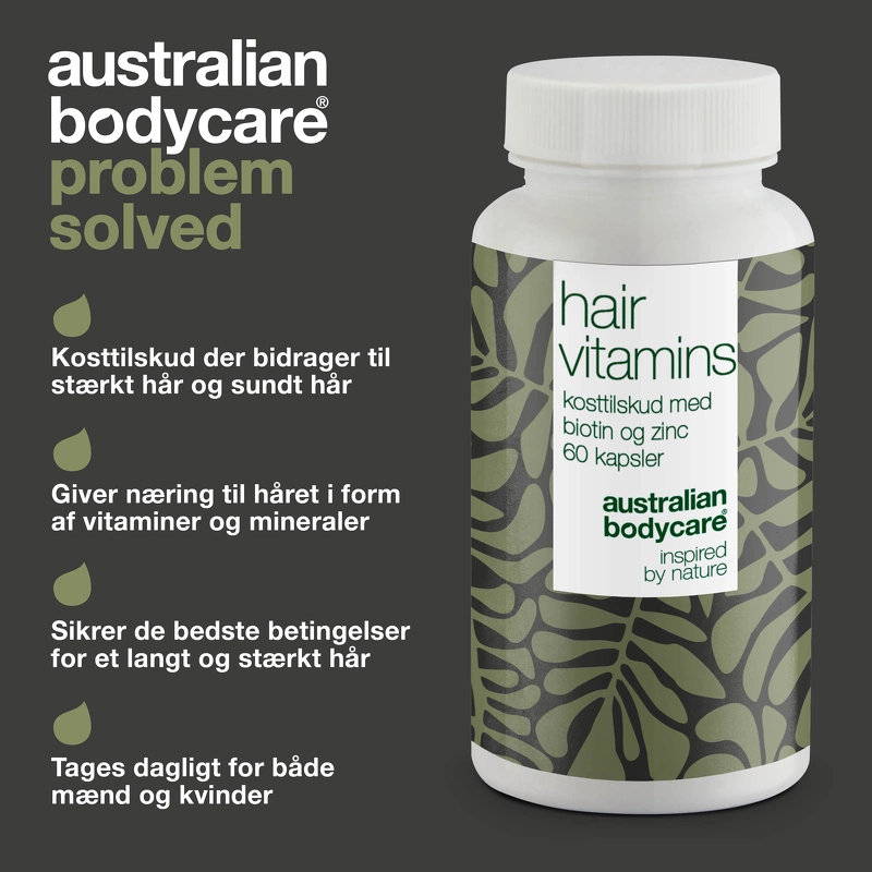 Australian Bodycare Hair Loss Care er et kostholdstilskudd designet for å redusere håravfall. De inneholder blant annet selen, biotin og sink, som bidrar til å opprettholde normalt hår. I tillegg bidrar de med kobber til en normal pigmentering av håret. Et godt tillegg til den australske Bodycare Hair Care-serien. Fordeler: - Tilskudd - Unisex - Mot hårtap Daglig dose: - Den anbefalte dosen er 2 kapsler om dagen - Denne har 60 kapsler, tilsvarende en måneds forbruk Ingredienser: Kalsiumkarbonat, skogs eple (Malus domestica Borkh.), Grønnsakskapsler: hydroksypropylmetylcellulose, lusernurt (Medicago sativa L.), ager soppurt (Equisetum arvense L.), blåbærekstrakt med 10% antocyanidiner ((Vaccinium myrtillus L.), nesleblad (Urtica dioica L.), asiatisk sentralblad (Centella asiatica (L.) Urb), kalsium L-askorbat, DL-alpha-Tocopherylacetat, cayenne pepper frukt (Capsicum annuum L), Ingefærrot (Zingiber officinale L.), Anti-kakemiddel: Silica, Kalsium-D-pantotenat, Kobberglukonat, sinkoksid, Nicotinamid, Menachinon-7 (soya), Retinylacetat, Riboflavin, D-Biotin, Sodium selenite Du kan se mer på bildet med varedeklarasjonen om hvor mye og nøyaktig hva kosttilskuddet inneholder MERK: - Oppbevares under 30 ° C og ikke i direkte sollys - Oppbevares utilgjengelig for barn - Bør bare tas av gravide eller barn under ett år etter avtale med lege eller helsepersonell - Bør ikke erstatte et variert kosthold - Den anbefalte daglige dosen bør ikke overskrides