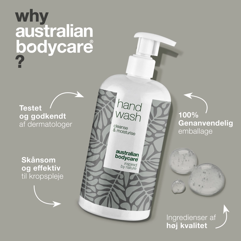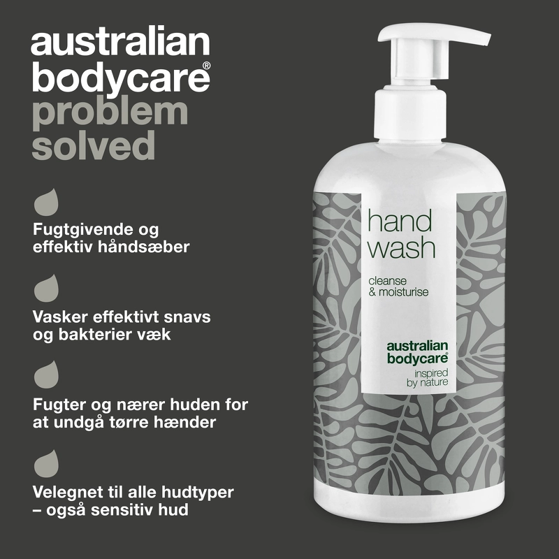 Australian Bodycare Hand Wash er en svært effektiv håndsåpe som bidrar til å opprettholde god håndhygiene. Den er beriket med Tea Tree Oil, som virker bakteriedrepende og derfor effektivt fjerner både bakterier og smuss fra hendene. For å opprettholde god hygiene er håndvask noe av det viktigste, og man bør derfor ikke gå på akkord med kvaliteten. Husk alltid å vaske hendene grundig, og vær spesielt oppmerksom på å vaske mellom fingrene, for å bli kvitt alle bakterier og skitt. Hvis du vasker hendene ofte, kan det være lurt å bruke en god håndkrem for å unngå at hendene tørker ut. Australian Bodycare Hand Wash er egnet for daglig bruk og kan brukes av hele familien. Fordel: - Flytende håndsåpe - Antibakteriell - Fjerner både smuss og bakterier - Vegansk – Uten parabener Applikasjon: - Skum opp med vann - Rens grundig - Kan brukes daglig Ingrediensliste: Aqua / Water, Sodium Laureth Sulfate, Coco-Betaine, Melaleuca Alternifolia (Tea Tree) bladolje, natriumklorid, fenoksyetanol, sitronsyre, tetranatriumiminodisuccinat, kaliumsorbat, natriumbenzoat, limonen