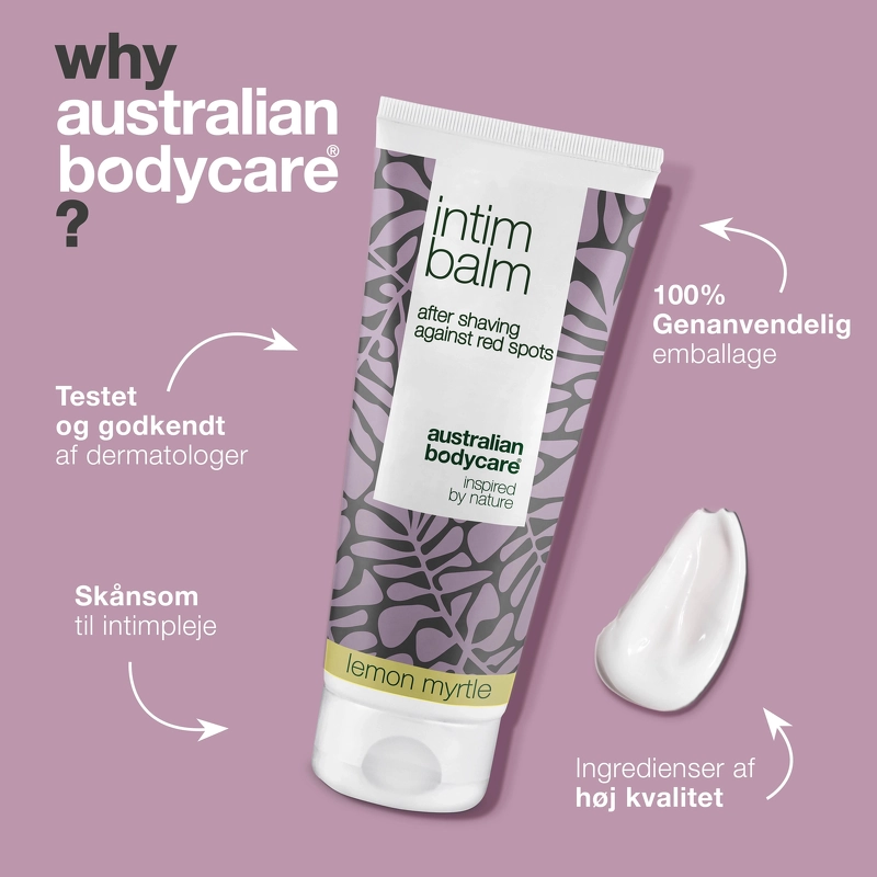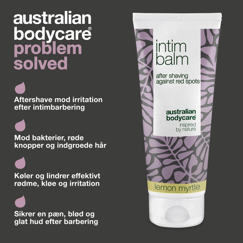 Australian Bodycare Intimate Balm Lemon Myrtle er en lett krem som brukes etter hårfjerning i intimområdet, hos både menn og kvinner, for å motvirke rødhet, nupper og inngrodde hår . Mange mennesker er klar over problemet med at huden blir rød, irritert og humpete etter barbering og hårfjerning, og noen lider til og med av inngrodde hår, noe som kan være ekstremt smertefullt - her er Australian Bodycare Intimate Balm Lemon Myrtle din redning ! Denne kremen har en beroligende effekt på huden, og bidrar dermed til å motvirke irritasjon som kan oppstå etter hårfjerning. 100 % naturlig Tea Tree Oil bidrar blant annet til å motvirke bakterier , som ellers kan skape betennelser i huden og gi de velkjente røde, kløende barberknoppene eller til og med skjeggpest. I tillegg er Australian Bodycare Intimate Balm Lemon Myrtle tilsatt fuktighetsgivende allantoin og beroligende ekstrakter fra Tasmansk pepper, som bidrar til å lindre tørr og irritert hud, på samme måte som de også bidrar til å redusere den slitsomme kløen du kan oppleve etter barbering. Denne varianten er også tilsatt sitronmyrt, som gir en herlig, forfriskende sitrusduft , men har også mange gunstige egenskaper. Den er blant annet med på å stimulere sunn hud, på samme måte som den bidrar til den fuktighetsgivende og antibakterielle effekten. Australian Bodycare Intimate Balm Lemon Myrtle er dermatologisk testet og har en justert pH-verdi , så den kan uten problemer brukes i hele intimområdet og i bikinilinjen, hvor det skal være påføres huden etter hver hårfjerning, enten du har brukt voks eller barbert, for best resultat. Fordel: - Krem for bruk etter intimbarbering eller voksing - Motvirker rødhet, nupper og inngrodde hår - Virker beroligende og beroligende - Lindrer tørrhet og irritasjon - Med 100 % naturlig Tea Tree Oil - Motvirker bakterier - Ph-verdi tilpasset intimområdet - Kan brukes av både menn og kvinner - Dermatologisk testet - Uten parabener - Vegansk Applikasjon: - Brukes som finish etter hårfjerning i intimområdet - Masser inn i huden med sirkulære bevegelser - Ikke skyll av – Vent litt med å ta på klær slik at huden kan få litt luft - Kan også brukes i dagene etter hårfjerning for ekstra beroligende effekt Ingrediensliste: ** Aqua / Water, Glycerin, PEG-7 Glyceryl Cocoate, Ethylhexyl Stearate, Hydrogenerated Polydecene, Dibutyl Adipate, C12-13 Alkyl Lactate, 4-Terpineol, Metylpropandiol, Acrylates / C10-30 Alkyl Acrylate Crosspolymer, SoAllainto Prolins. , Tetrasodium Iminodisuccinate, Tocopherol, Caprylyl Glycol, Sodium Hydroxide, Tasmannia Lanceolata Fruktekstrakt, Fenylpropanol, Melaleuca Alternifolia (Tea Tree) bladolje.