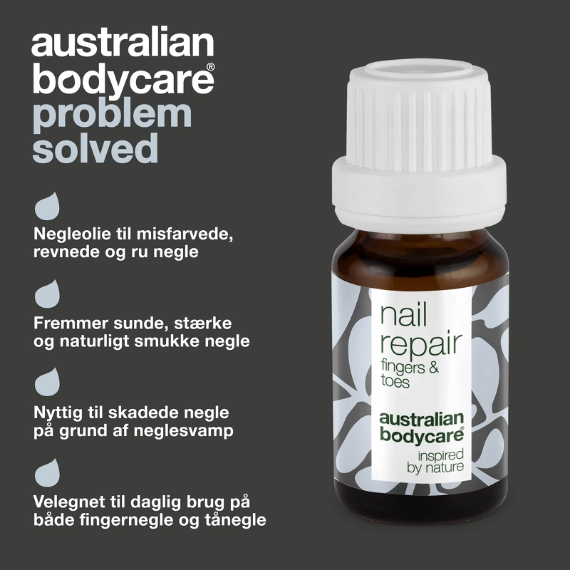 Australian Bodycare Nail Repair er en neglebehandling for de som ønsker å si farvel til misfargede, ru og sprukne negler. Den inneholder en unik kombinasjon av 4-Terpineol (den aktive ingrediensen fra tea tree-olje) og vitamin E, noe som gjør formelen svært effektiv i kampen mot neglesopp og problemer. Behandlingen beskytter, styrker og stimulerer neglene, noe som gir sunn vekst, og må påføres med den medfølgende børsten. Med Australian Bodycare Nail Repair kan du se frem til sunne og sterke negler. Fordeler: - Neglebehandling - Forebygger misfargede, ru og sprukne negler - Inneholder en kombinasjon av 100 % tea tree-olje og vitamin E - Effektiv mot neglesopp og -problemer - Beskytter, styrker og stimulerer neglene - Gir sunn vekst - Børsten for påføring er innebygd i lokket - Dermatologisk testet - Vegansk Påføring: - Påfør morgen og kveld på det berørte området med påføringsbørsten - La neglen tørke før du tar på sokker eller legger deg - Fortsett til den nye neglen vokser ut Ingrediensliste: 4-Terpineol, Helianthus Annuus Hybrid Oil, Tocopherol, Vegetabilsk olje, Linalool