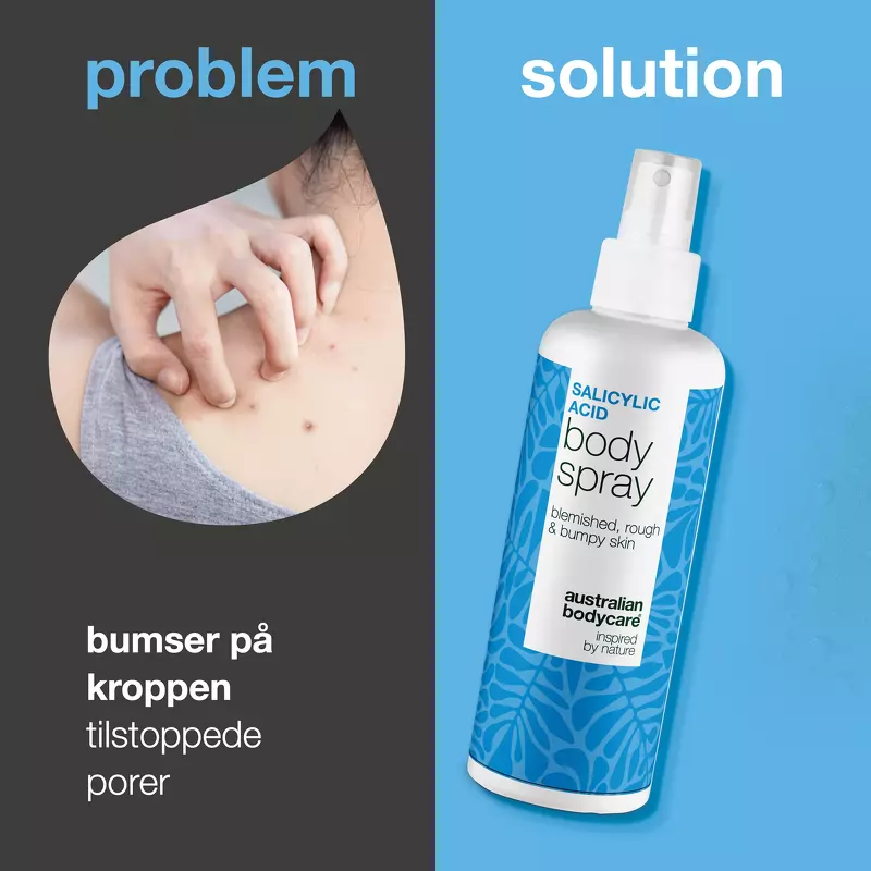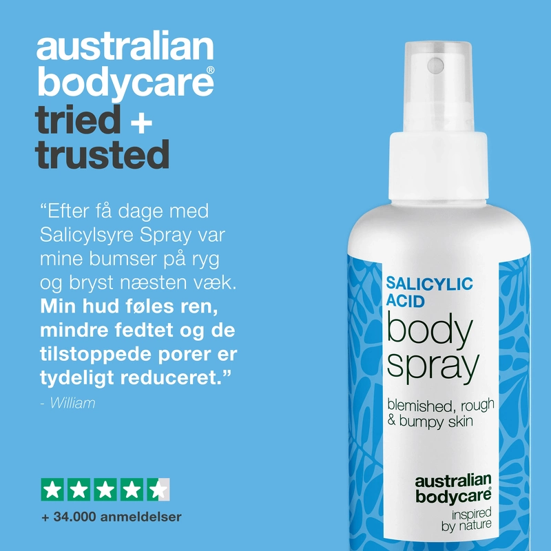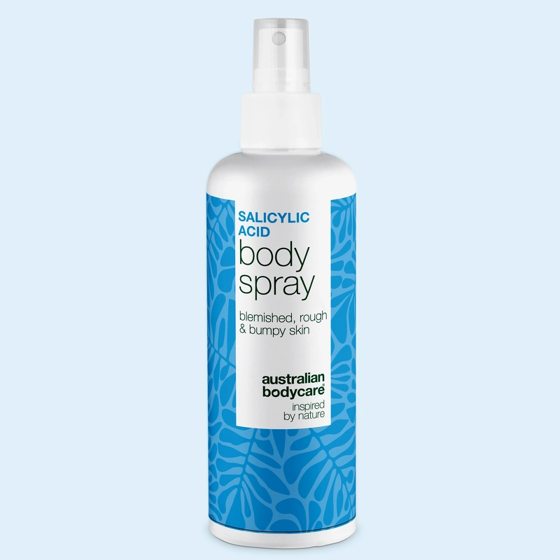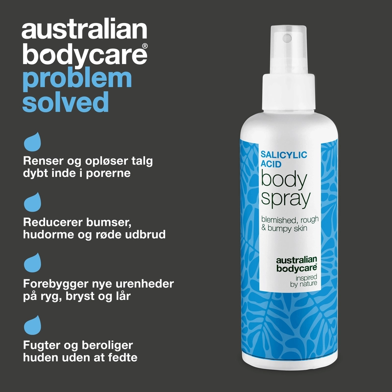 Australian Bodycare Salicylic acid Body Spray er en spray for urenheter på kroppen – Si farvel til kviser og urenheter – og hei til ren og vakker hud over hele kroppen. Er du lei av kviser som dukker opp på ryggen, baken, brystet eller bena – uansett hvor godt du tar vare på huden din? Har du prøvd utallige produkter uten effekt? Du er ikke alene. Mange sliter med kviser og urenheter på kroppen som ikke forsvinner, selv om de vasker og pleier huden sin daglig. Det kan være frustrerende, smertefullt og påvirke både selvtilliten og ønsket om å vise frem huden sin. Kviser på kroppen er ofte forårsaket av tette porer, overflødig talg og bakterier som bygger seg opp – spesielt på områder der huden er dekket av klær, svetter mye eller utsettes for friksjon. Og her trenger du mer enn bare vanlig såpe. Du trenger noe som faktisk fungerer. Salicylic Acid Body Spray med 2 % salisylsyre og glykolsyre er spesielt utviklet som en problemløsende hudpleieløsning for kviser og urenheter på kroppen. Den er inspirert av naturen og satt sammen av nøye utvalgte ingredienser som virker i dybden – uten å tørke ut eller irritere huden. Det er en unik kombinasjon som både renser, lindrer og forebygger nye utbrudd. Sprayen kan brukes på alle områder av kroppen der du opplever kviser og uren hud – og er ideell for både forebygging og pleie i hverdagen. Slik fungerer sprayen – og hvorfor den utgjør en forskjell: Denne kroppssprayen er mer enn bare en overfladisk løsning. Den trenger inn i porene og virker innenfra, der problemene starter. 2 % salisylsyre løsner og løser opp blokkeringer i porene, glykolsyre eksfolierer hudens overflate og forbedrer hudens struktur, mens sinklaktat regulerer talgproduksjonen og motvirker bakterier. Samtidig beskytter glyserin og panthenol huden mot uttørking og irritasjon. Dette betyr at du får en effektiv og skånsom løsning som kan brukes hver dag – og som faktisk hjelper huden din med å bli fri for kviser og urenheter. Fordeler: - Spray mot urenheter på kroppen - Effektiv mot kviser på rumpa - Bekjemper kviser på brystet - Ideell for kviser på beina - 2 % salisylsyre trenger inn i porene og løser opp talg og døde hudceller - Glykolsyre forbedrer hudens struktur og eksfolierer skånsomt - Sinklaktat reduserer rødhet og regulerer talgproduksjonen - Panthenol (provitamin B5) lindrer huden og motvirker irritasjon - Glyserin gir intens fuktighet og styrker hudens barriere - Bra for kviser på ryggen - Vegansk Bruk: - 1. Rist flasken godt før bruk. Før hver påføring er det viktig å riste flasken grundig slik at ingrediensene fordeles jevnt. - 2. Rens huden. Start alltid med å rense huden grundig - helst med en dusjsåpe med salisylsyre - for å fjerne smuss, svette og bakterier. - 3. Spray på de berørte områdene. Hold flasken ca. 10–15 cm fra huden og spray et jevnt lag på områdene der du opplever kviser og uren hud (f.eks. rygg, rumpe, bryst, ben). - 4. La produktet tørke. La sprayen tørke helt før du kler på deg. Den tørker raskt og etterlater ingen klissete følelse. - 5. Bruk 1–3 ganger daglig. Du kan bruke sprayen opptil tre ganger daglig – morgen, kveld og eventuelt etter trening – avhengig av hudtype og behov. Start med én gang daglig og øk gradvis om nødvendig. Bonustips: Bruk sprayen etter bading og før sengetid, når huden er ren og mottakelig. For enda bedre resultater, kombiner den med en bodylotion eller krem med salisylsyre – og bruk en eksfolierende kroppsskrubb med salisylsyre 1–2 ganger i uken. Dette bidrar til å fjerne døde hudceller og forbedrer effekten av sprayen. Kombiner sprayen med andre spesialutviklede produkter fra Australian Bodycare i samme serie: - En kroppsvask med salisylsyre, som skånsomt renser kroppen og forbereder huden - En krem eller bodylotion med salisylsyre, som holder huden fuktet og fortsetter å virke etter sprayen - En kroppsskrubb med salisylsyre, som gir en mer intens peeling 1-2 ganger i uken - Salisylsyreplaster (kviseplaster), som kan brukes direkte på mer gjenstridige kviser Ingrediensliste: Aqua/Water Butylenglykol Propandiol Glyserin Glykolsyre Salisylsyre Panthenol Natriumhydroksid Fenoksyetanol Sinklaktat * Tetranatriumiminodisuccinat.