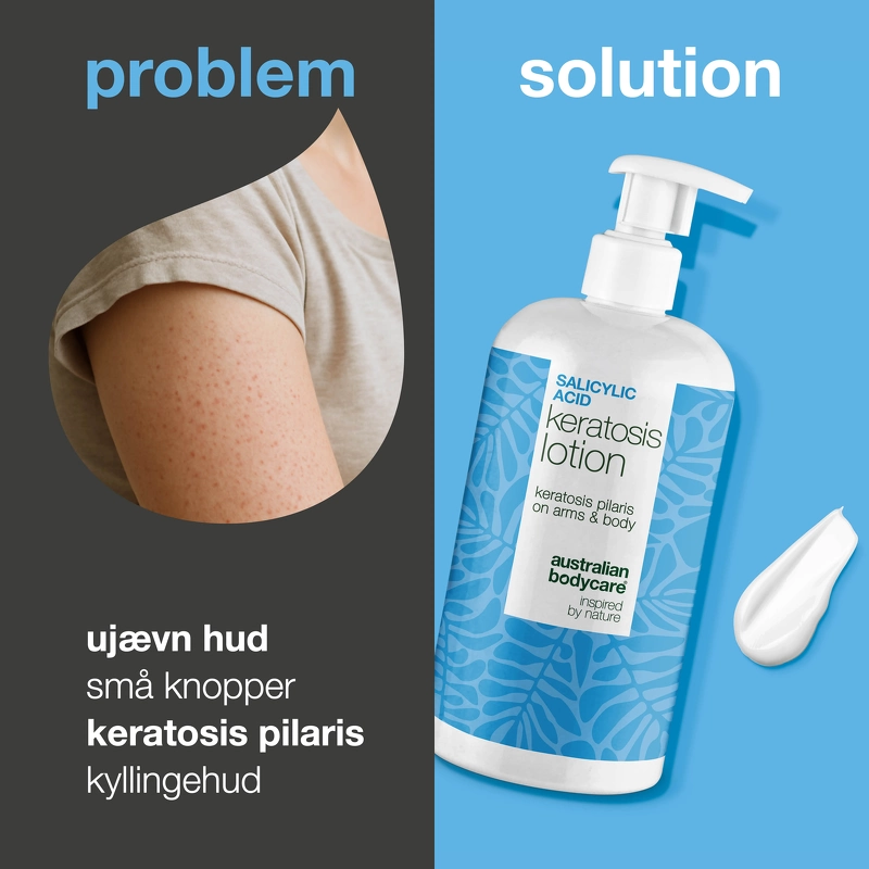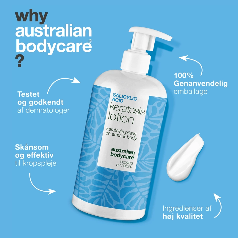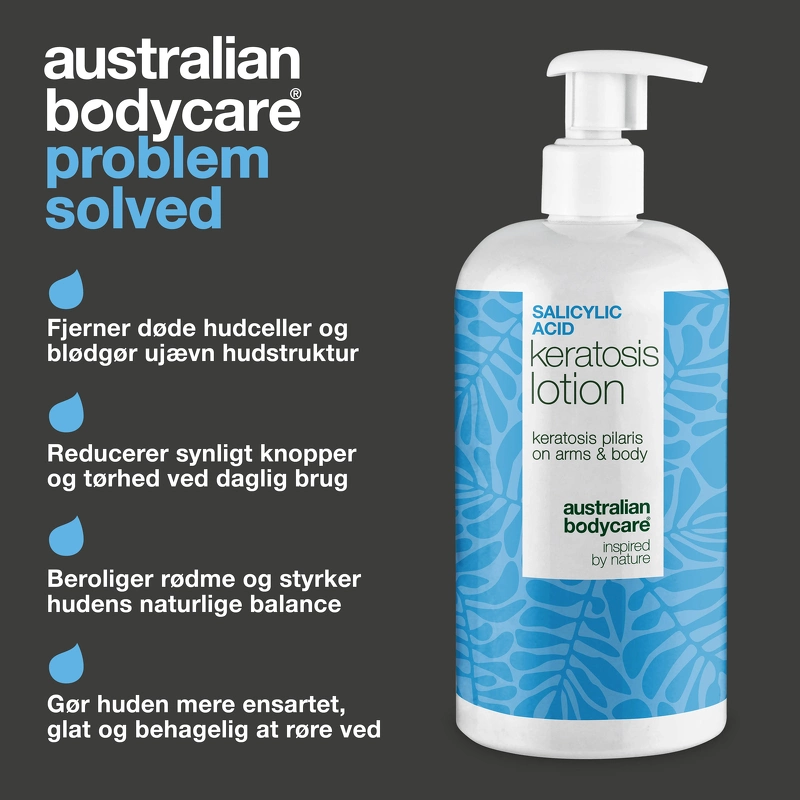Australian Bodycare Salicylic Acid Keratosis Lotion er en spesialutviklet bodylotion for Keratosis Pilaris. Har du små, grove nupper på overarmene, lårene eller baken som ikke vil forsvinne? Føles huden din ujevn, tørr og irritert uansett hvor mye du smører den på? Da er du langt fra alene. Keratosis Pilaris – også kjent som kyllingskinn, jordbærskinn eller små nupper på armene – er en svært vanlig hudtilstand som oppstår når døde hudceller og keratin bygger seg opp og tetter hårsekkene. Resultatet er små, harde nupper som ofte føles som sandpapir – og det kan være både frustrerende og kosmetisk irriterende. Derfor har Australian Bodycare utviklet en unik og spesialutviklet bodylotion som spesifikt hjelper deg med å bli kvitt de grove nuppene og gjenopprette mykere, jevnere hud. En problemløsende hudpleieløsning som er både effektiv og skånsom – inspirert av natur og vitenskap. Slik fungerer Keratosis Pilaris Body Lotion – og hvorfor den utgjør en forskjell: Denne lotionen er satt sammen av en rekke nøye utvalgte aktive ingredienser som jobber sammen i dybden og på hudoverflaten for å forbedre hudens struktur og komfort. Formelen fokuserer på å eksfoliere, berolige, balansere og fuktighetsgivende, uten å overbelaste eller irritere huden. De 5 viktigste ingrediensene i kampen mot Keratosis Pilaris: - Salisylsyre (BHA): En veldokumentert eksfolierende ingrediens som trenger dypt inn i porene og løser opp ansamlinger av døde hudceller og talg – selve kjernen i problemet med Keratosis Pilaris. - Niacinamid (vitamin B3): Reduserer rødhet og irritasjon, styrker hudens barriere og bidrar til en mer jevn hudstruktur. Hjelper også mot misfarging og ettervirkninger fra tidligere utbrudd. - Allantoin: En beroligende og reparerende ingrediens som motvirker tørrhet og ruhet som mange med KP opplever daglig. - Sink PCA: Beskytter huden mot bakteriell ubalanse og bidrar til å regulere talgproduksjonen – to faktorer som ofte forverrer kviser og irritasjon. - Hydrogenert olivenolje, uforsåpbare: En naturlig utvunnet, nærende oljefraksjon som fukter huden i dybden samtidig som den opprettholder hudens elastisitet – uten å tette porene. Denne bodylotionen er for deg som opplever: Små, harde kviser på overarmer, lår eller rumpe Rødhet, ujevn hud og tørrhet Kyllinghud eller ru hud som ikke glattes ut av regelmessig fuktighetskrem Bruk lotionen hver dag etter bading, helst i kombinasjon med de andre produktene fra vår Keratosis Pilaris-serie, for den mest målrettede og effektive pleien. Fordeler: - Bodylotion mot Keratosis Pilaris - Utviklet for ru hud og små nupper - Reduserer ujevn hudtekstur - Gjør huden mykere og jevnere - Eksfolierer og fjerner akkumulerte døde hudceller - Lindrer rødhet og irritasjon - Fukter og forbedrer hudkomforten - Passer for armer, lår og rumpe - Anbefales for daglig bruk - Ideell for kyllinghud og tørre nupper - Inspirert av natur og vitenskap - Vegansk Bruk: - 1. Rens huden med en mild dusjsåpe. Start i badekaret med Keratosis Pilaris Body Wash, som fjerner døde hudceller og overflødig talg uten å tørke ut. Den forbereder huden og gjør den mer mottakelig for de aktive ingrediensene. - 2. Klapp huden forsiktig tørr. Etter badet, klapp huden tørr med et rent håndkle. Unngå å gni, da huden ofte er sensitiv med Keratosis Pilaris. - 3. Påfør først Keratosis Pilaris Spray. Spray et jevnt lag direkte på de berørte områdene (vanligvis overarmer, lår eller rumpe). La sprayen trenge inn i huden og tørke helt. De aktive syrene – inkludert salisylsyre – eksfolierer i dybden og bidrar til å løse opp keratinproppene som forårsaker kulene. - 4. Påfør deretter Keratosis Pilaris Body Lotion. Når sprayen er tørr, påfør bodylotionen over. Den fukter, mykgjør og beskytter huden – og støtter hudens naturlige barriere. 5. Gjenta daglig for best resultat Bruk produktene én gang daglig – helst etter bading – og fortsett rutinen selv når huden forbedres, for å opprettholde resultatene. Viktig: Husk solbeskyttelse. Siden både Keratosis Pilaris Spray og Body Lotion inneholder salisylsyre, kan huden bli mer følsom for sollys. Derfor anbefaler vi alltid å bruke en daglig solkrem med høy SPF på de behandlede områdene – spesielt hvis du viser huden din i solen. Dette beskytter huden og forhindrer pigmentforandringer. Bonustips: Konsistens gir resultater. De fleste opplever synlige forbedringer etter 3–4 uker med daglig bruk. Maksimal effekt sees vanligvis etter 8–12 uker. Fortsett – selv når huden føles glatt – for å forhindre at problemet kommer tilbake. Din komplette rutine mot Keratosis Pilaris: - Kroppssåpe – skånsom rens og forberedelse - Spray – eksfolierende og målrettet behandling - Bodylotion – fuktighetsgivende og mykgjørende pleie - Solbeskyttelse (SPF) – beskytter mot UV-skader og irritasjon Ingrediensliste: