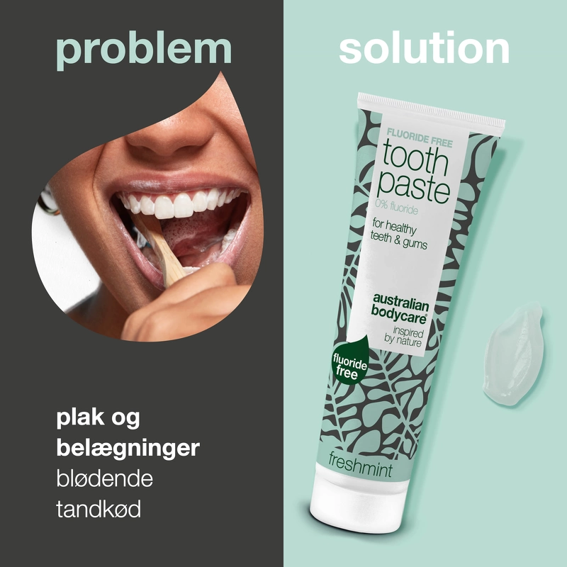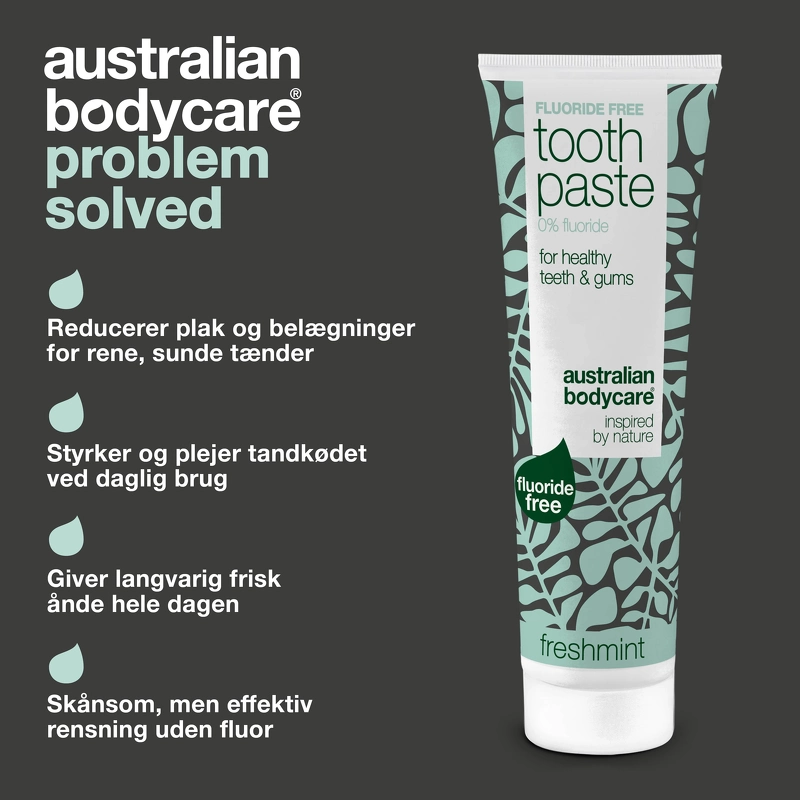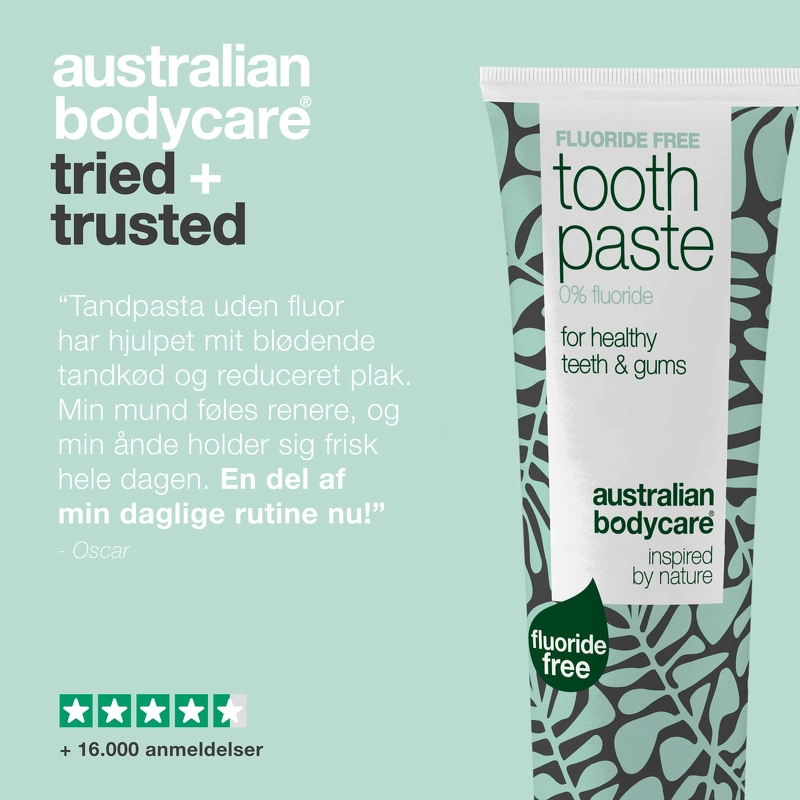 Australian Bodycare Tooth Paste uten fluor er en fluorfri tannkrem som sikrer effektiv rengjøring og pleie av tenner og tannkjøtt. Opplever du ofte sårt eller blødende tannkjøtt? Leter du etter en fluorfri tannkrem som fortsatt rengjør effektivt og bidrar til å opprettholde sunn munnhygiene? Mange ønsker en tannkrem som er mild, men likevel kraftig nok til å beskytte tennene mot plakk og dårlig ånde. Vår spesialutviklede fluorfrie tannkrem er laget for nettopp dette formålet – inspirert av naturen og fullpakket med aktive ingredienser som hjelper deg med å opprettholde et sunt smil. Denne unike tannkremen er formulert for daglig bruk og bidrar til å rengjøre tennene grundig, pleie tannkjøttet og bekjempe dårlig ånde. Den inneholder naturlig 4-terpineol, en aktiv ingrediens kjent fra tea tree-olje, som bidrar til å holde munnhulen frisk og ren. Samtidig gir peppermynteolje og mentol en frisk og behagelig smak som gir en langvarig følelse av renhet. Detaljer: - Tannkrem uten fluor - Fjerner plakk og matrester for rene og sunne tenner - Pleier og styrker tannkjøttet - Perfekt for de med sensitivt eller blødende tannkjøtt - Frisk pust hele dagen
