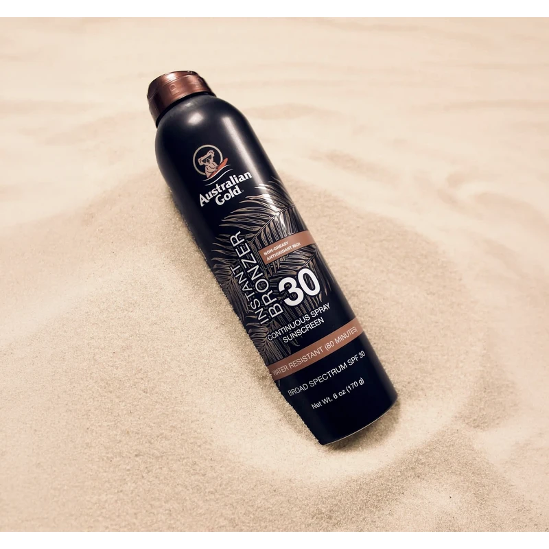 Australian Gold Instant Bronzer Continuous Spray SPF 30 er en solkrem som gir huden en umiddelbar glød og er ideell når en rask påføring kombinert med litt farge er ønsket. Opplev en 360° spray som sikrer enkel og lett påføring på hele kroppen fra alle vinkler. Samtidig er Australian Gold kjent for sine raskest absorberende teksturer som føles lette på huden og tørker raskt. Fordeler: - Solkrem - Bredspektret beskyttelse SPF 30 mot UVA/UVB-stråler - Vannbestandig i opptil 80 minutter - Instant bronzer med karamell som gir en vakker glød - Fuktighetsgivende og nærende Aloe Vera - Signaturduft av Cocoa Dreams Bruk: - Rist godt før bruk - Påfør rikelig 15 minutter før soleksponering, og oppbevar beholderen ca. 10–15 cm fra huden under påføring - Vi anbefaler ikke å spraye direkte i ansiktet, men i stedet på hendene og deretter smøre i ansiktet - Unngå å bruke produktet i vindfulle forhold for optimal dekning av solfaktoren - Påfør på nytt etter 80 minutters bading eller svetting, umiddelbart etter tørking med et håndkle og minst annenhver time for å opprettholde optimal beskyttelse - Produktet inneholder ingredienser som kan sette flekker og misfarge tekstiler Ingrediensliste: Alkohol Denat., Ethylhexyl Salicylate, Octocrylene, Butyloctyl Salicylate, Butyl Methoxydibenzoylmethane, VA/Butyl Maleate/Isobornyl Acrylate Copolymer, Water/Aqua/Eau, Fragrance (Parfum), Polyester-8, Helianthus Annuus (Solsikke) Seed Oil, Tocopherol Acetate, Aloe Barbadensis Leaf Extract, Malaleuca Alternifolia (Tea Tree) Leaf Oil, Citrus Aurantium Peel Oil, Limonene, Vanillin, Coumarin, Methyl Salicylate, Linalool, Benzyl Alkohol, Citra, Terpineol, Pins, Gul 5 (CI 19140), Rød (CI 16035), Blå 1 (CI42090)