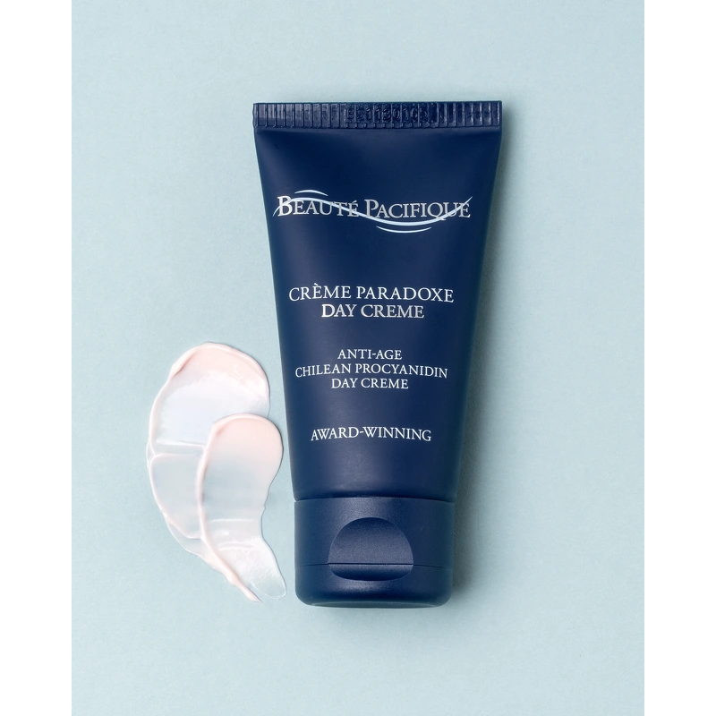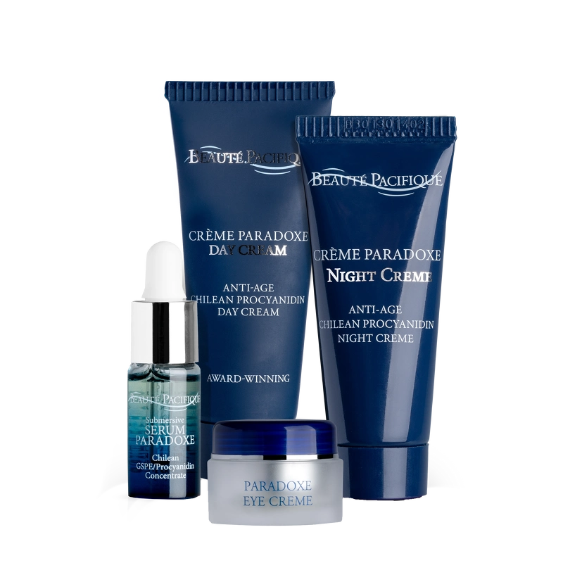Beauté Pacifique Paradoxe Anti-Age Trial Kit er et deilig sett med våre populære produkter fra Paradoxe-serien for voksen hud. Gjenopprett sunn og robust hud med Paradoxe. Produktene reduserer og forebygger rødhet, samt reparerer solskader og forsinker aldersrelaterte forandringer som fine linjer og rynker. Paradoxe kan brukes av nesten alle hudtyper – selv delikat og sensitiv hud. Den bestselgende dagkremen har en anti-aging og anti-rødhetseffekt. Den gir næring, fukter og mykgjør huden og har en fin og silkemyk tekstur. Crème Paradoxe anti-age nattkrem har en rekke aktive ingredienser som reparerer huden i dybden og gir optimal pleie hele natten. Paradoxe anti-age øyekrem er en herlig parfymefri øyekrem som er mild og myk, men samtidig svært aktiv når det gjelder å stramme opp og fukte det delikate øyeområdet. Serum Paradoxe er en rik og myk tørr olje med anti-aging og antiinflammatoriske egenskaper. Reduserer rødhet og gir en jevnere hudtone. Settet inneholder: - 1 stk. Beauté Pacifique Crème Paradoxe Anti-Age Day Creme 40 ml - 1 stk. Beauté Pacifique Crème Paradoxe Night Creme 20 ml - 1 stk. Beauté Pacifique Paradoxe Eye Creme 5 ml - 1 stk. Beauté Pacifique Submersive Serum Paradoxe