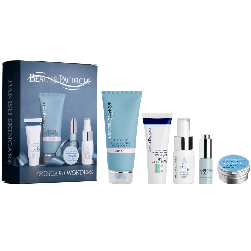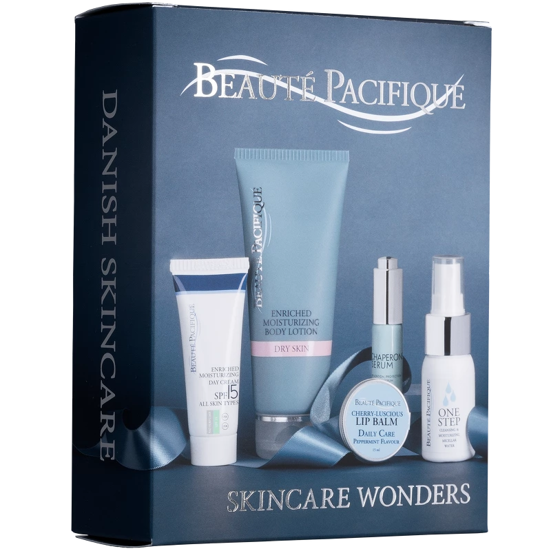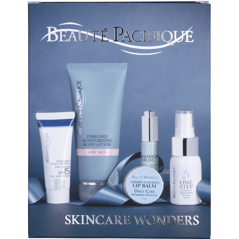 Beauté Pacifique Skincare Wonders Julen 2025 er en fantastisk vertinnegave med fantastiske hudpleieprodukter. Dette vertinnesettet – «Skincare Wonders» – inneholder fantastiske hudpleieprodukter som styrker, reparerer og fukter huden. Dette er noen av favorittene fra Beauté Pacifique, som garantert vil skape glede. Boksen inneholder et komplett dagsett med rens, serum og dagkrem, en mykgjørende leppepomade og en deilig fuktighetsgivende bodylotion. Totalt fem fantastiske og populære produkter for flere aldre og hudtyper. Esken inneholder: - Beauté Pacifique One Step Cleansing & Moisturizing Water 30 ml - Beauté Pacifique Chaperone Enerich Moisturizing Serum 5 ml - 15 20 ml - Beauté Pacifique Cherry-Luscious Lip Balm 15 ml - Peppermynte - Beauté Pacifique Enriched Moisturizing Body Lotion 100 ml - Tørr Hud