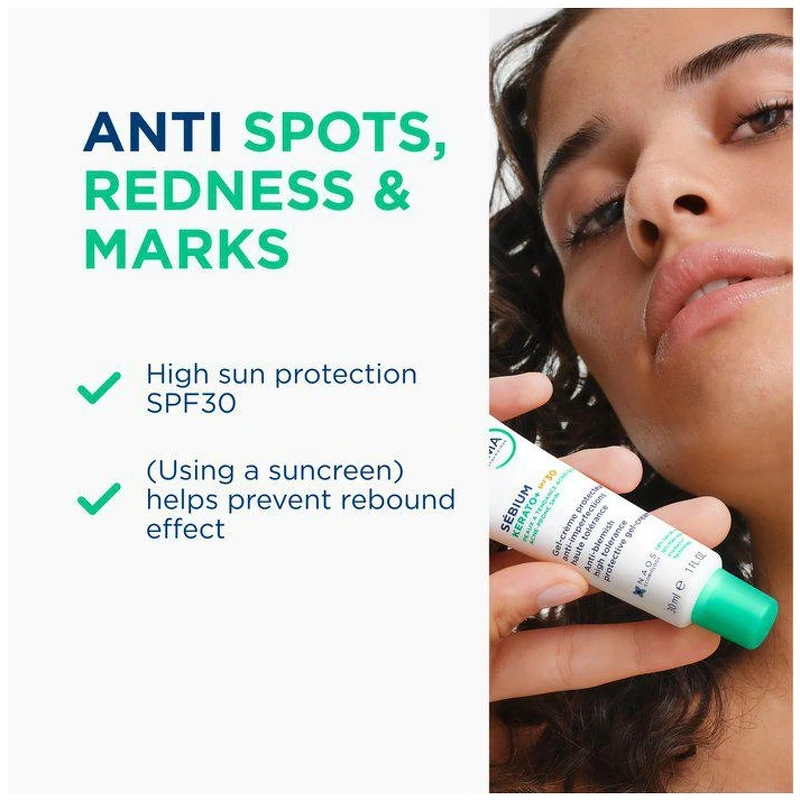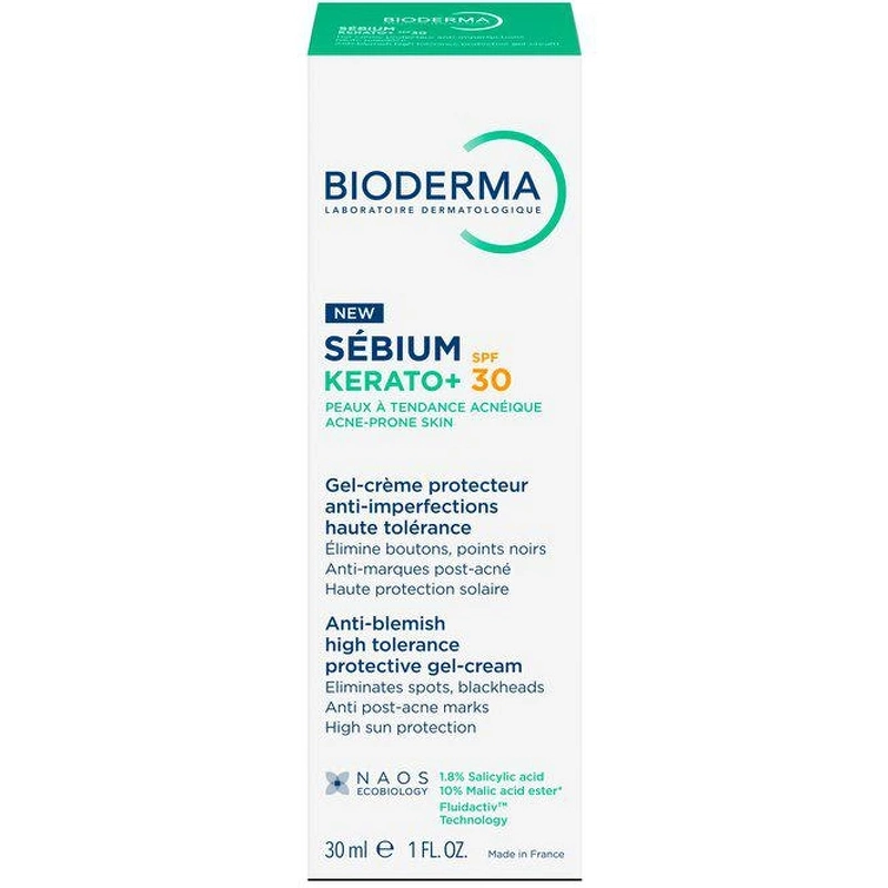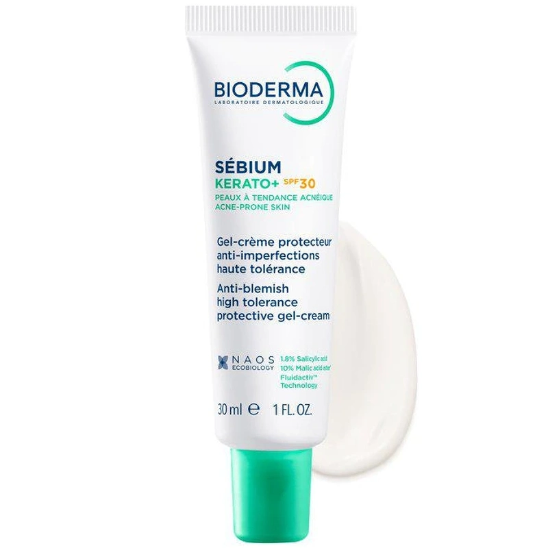 Bioderma Sébium Kerato+ SPF30 er en høytolerant dagkrem med solbeskyttelse, spesielt utviklet for hud som er utsatt for urenheter og tette porer. Den reduserer ujevnheter og beskytter huden mot UV-stråler (SPF30), samtidig som den gir en matt finish. En effektiv kombinasjon av salisylsyre og eplesyreester gir skånsom peeling og forbedrer hudens tekstur, mens bredspektrede UV-filtre beskytter mot solens skadelige effekter. Den patenterte Fluidactiv™-teknologien bidrar til å normalisere talgkvaliteten og forhindre tette porer – en viktig faktor for å redusere risikoen for nye utbrudd. Den fuktighetsgivende, usynlige teksturen absorberes raskt uten å være fet, lo eller etterlate hvite merker. Passer for daglig bruk – selv under sminke. Sébium er BIODERMAs hudpleieserie for kombinert til fet og akneutsatt hud. Produktene balanserer talgproduksjonen, forfiner hudens tekstur og styrker hudens naturlige funksjoner – med høy toleranse, selv for sensitiv hud. Fordeler: - Dagkrem med SPF 30 - Reduserer urenheter og forfiner porene - SPF 30 bredspektret beskyttelse - Lett, fuktighetsgivende tekstur - Perfekt som sminkebase Bruk: - Påfør om morgenen på renset ansikt - Unngå øyeområdet - Unngå soleksponering