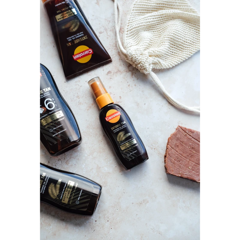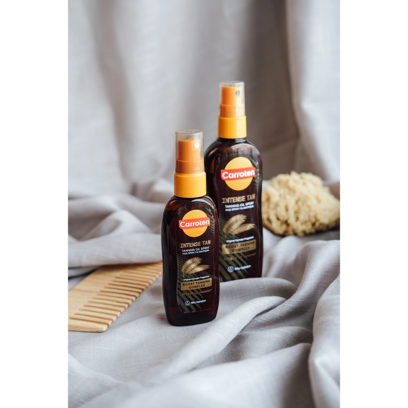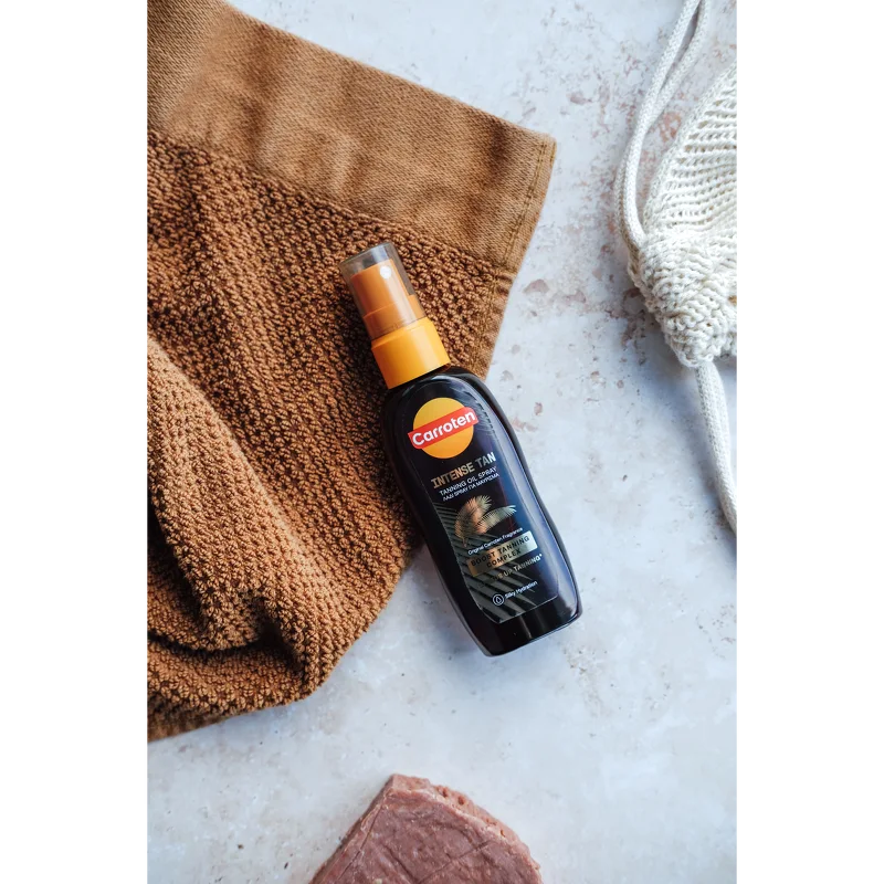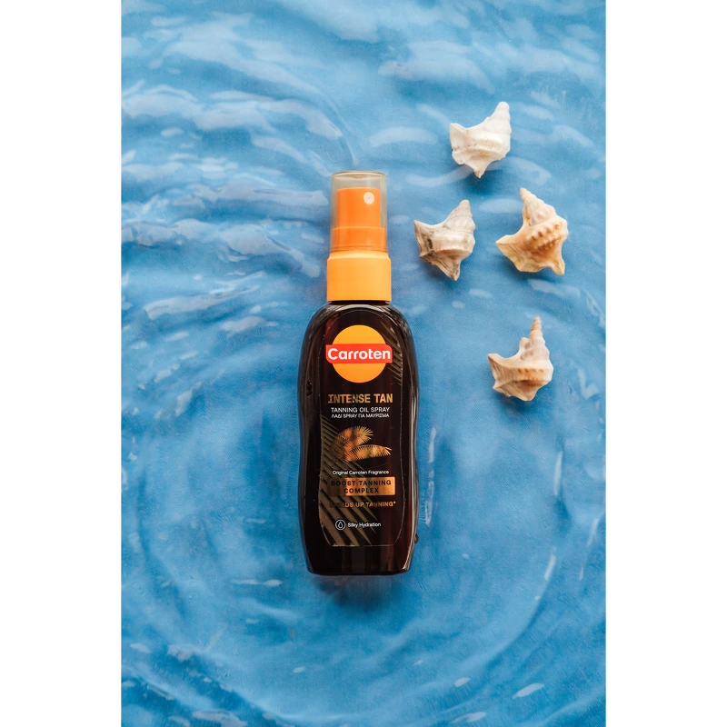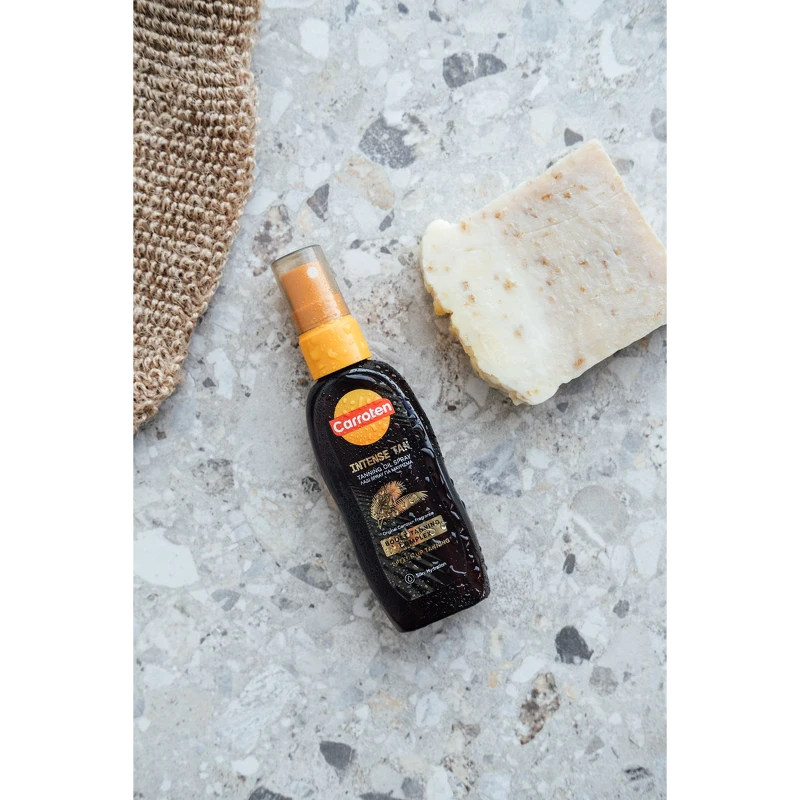 Carroten Intense Tan Oil SPF 0 er en sololje som fremmer hudens naturlige bruningsprosess og gir en intens, gyllen glød. Den lette oljesprayformen gjør produktet lett å smøre på huden og etterlater en silkemyk finish. Formelen er beriket med Carrotens Infinite Tanning System, hvor gulrot og kokosolje bidrar til å akselerere fargeutviklingen og fremheve en jevnere og mer strålende brunfarge. Innholdet av antioksidantene vitamin A og E bidrar til å pleie huden under soleksponering og etterlater huden myk og velstelt. Merk: SPF 0. Produktet inneholder ikke UV-filtre og beskytter derfor ikke mot UV-stråling. Fordeler: - Sololje uten SPF - Fremmer hudens naturlige bruningsprosess - Med gulrot- og kokosolje - Inneholder antioksidantene vitamin A og E - Gir en raskere og mer intens glød - Vegansk og dermatologisk testet Bruk: - Spray et sjenerøst og jevnt lag over hele kroppen før soleksponering, og påfør ofte - spesielt etter bading, tørking og svetting - Produktet inneholder ingredienser som kan misfarge tekstiler