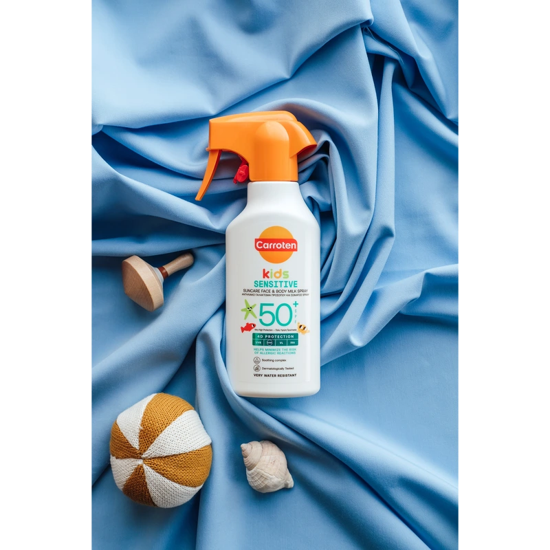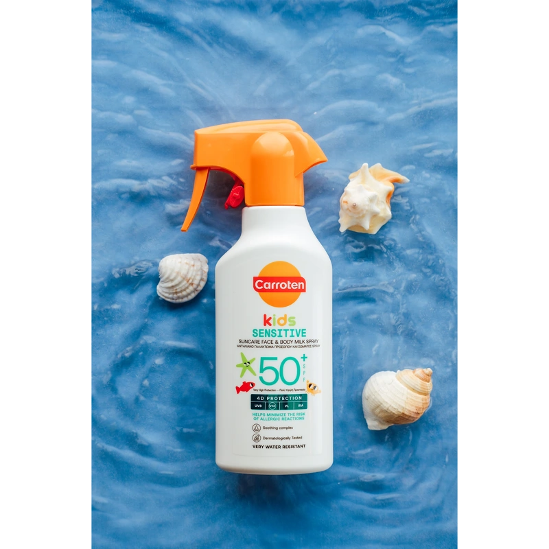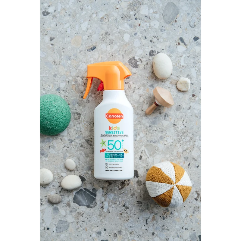 Carroten Kids Sensitive Milk Trigger SPF 50+ er en solkrem for de minste. Solsprayen beskytter sensitiv hud mot et bredt spekter av solstrålene UVB + UVA + VL* + IRA og bidrar samtidig til å minimere risikoen for allergiske reaksjoner. Den milde formelen og triggerteknologien sikrer enkel påføring og rask absorpsjon. Det lindrende komplekset av blant annet panthenol og allantoin lindrer, gir lindring og reduserer irritasjon forårsaket av soleksponering på huden. Fordeler: - Solkrem for barn - Bredspektret SPF50+ beskyttelse mot UVB, UVA, VL og IRA - Vegansk og utviklet spesielt for barns sensitive hud - Parfymefri, ekstra skånsom mot delikat hud - Mild og hudvennlig formel, egnet for daglig bruk - Triggerspray sikrer enkel og rask påføring Påføring: - Rist godt før bruk - Spray et sjenerøst og jevnt lag over hele kroppen før soleksponering - For ansiktet, spray produktet først i hendene og påfør deretter, unngå øyeområdet - Påfør ofte, spesielt etter bading, tørking og svetting - Solkremer bør påføres 20 minutter før soleksponering - Gjentatt påføring anbefales hver 2. time og etter bading/tørking