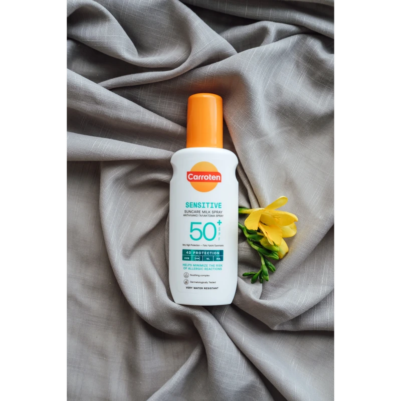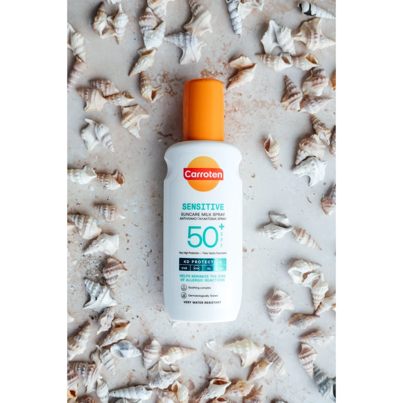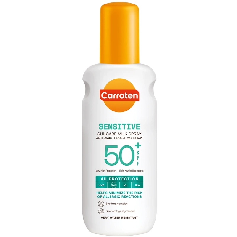 Carroten Sensitive Milk Spray SPF 50+ er en solkrem som gir svært høy solbeskyttelse og er spesielt utviklet for sensitiv hud. Den milde og parfymefrie formelen gir avansert 4D-beskyttelse mot UVB-, UVA-, VL- og IRA-stråler og bidrar til å beskytte huden mot solens skadelige effekter. Beriket med hyaluronsyre gir den intensiv fuktighet og bidrar til å opprettholde hudens naturlige fuktighetsbalanse, selv under soleksponering. Den praktiske sprayen gjør produktet enkelt å påføre, absorberes raskt og etterlater huden myk og velstelt uten å være fet. Fordeler: - Solkrem - SPF 50+ med bredspektret beskyttelse mot UVB, UVA, VL og IRA - Spesialutviklet for sensitiv hud - Parfymefri - Lett konsistens som absorberes raskt uten å bli fet Bruk: - Rist godt før bruk - Spray et sjenerøst og jevnt lag over hele kroppen før soleksponering - For ansiktet, spray produktet først i hendene og påfør deretter, unngå øyeområdet - Påfør ofte, spesielt etter bading, tørking og svetting - Solkremer bør påføres 20 minutter før soleksponering - Gjentatt påføring anbefales hver 2. time og etter bading/tørking.