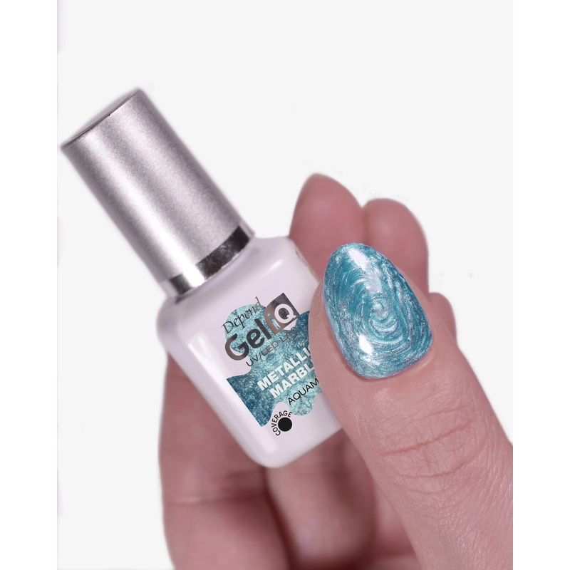 Depend Cosmetic Gel iQ Effects Metallic Marble - Aquamarine er en fantastisk effektlakk som lar deg la kreativiteten løpe løpsk og oppnå profesjonelle resultater med maksimal effekt. Bruk lakken som den er, hvor du får en blank Pearl Metallic-finish, lag unike mønstre med en pensel eller lag en vakker Marble-effekt med Dotting Tool – bare fantasien setter grenser. Merk: For å oppnå Marble-effekten må denne lakken brukes sammen med Depend Dotting Tools, som kan kjøpes her. Lakk, lag, herd – og nyt et design som bare du kan lage. Hver negl blir et lite kunstverk i seg selv. Fordeler: - Effektlakk - Pearl Metallic finish - Opaque - Low Marble-effekt i kombinasjon med Dotting Tool - Lag unike mønstre med en pensel - Kan brukes med og uten basefarge - Vegansk Bruk: Viktig: Hvis baselakk, farget neglelakk eller topplakk kommer i kontakt med huden rundt neglen, må den fjernes med Pre-Cleanser på en bomullspinne FØR herding - Bruk etter påføring av Pre-Cleanser og Gel iQ Base Coat - Påfør først et tynt lag med Metallic Marble og herd i 60 sekunder i UV/LED-lampen (trykk på 30 sek.-knappen to ganger) - Lakk deretter bare én negl om gangen - Påfør et nytt tynt lag med Metallic Marble uten å herde - Bruk om nødvendig Dotting Tool eller pensel for å lage et mønster - Hvis du ikke er fornøyd med mønsteret, kan du kan stryke ut lakken med en strøk børste og starte på nytt med magneten (kan bare gjøres så lenge lakken ikke er herdet ennå!) - Når du er fornøyd med mønsteret, la lakken hvile i 5-10 sekunder - Herd deretter lakken i 60 sekunder under UV/LED-lampen - Gjenta for alle neglene - Påfør et tynt lag med Top Coat på alle neglene og herd under lampen i 30 sekunder - Til slutt, rens alle neglene med High Shine Cleanser - Avslutt med å vaske hendene grundig med såpe og vann Fjerning: - Fjern forsiktig med Gel iQ Remover Oil Method 1 - Bruk [Gel iQ Remover Method] 2](/depend-cosmetic-gel-iq-remover-method-2---35-ml-1.html) og Gel iQ Removal Wraps Foil Method 2 i tilfeller der neglelakken er vanskelig å fjerne Ikke bruk Gel iQ hvis: - Du tidligere har hatt en allergisk reaksjon etter bruk av UV/LED-herdede produkter - Du er overfølsom for akrylater, da disse produktene kan forårsake en allergisk reaksjon - Du har sår eller sprekker i neglebåndene eller lignende, eller hvis neglene dine er i dårlig forfatning (tynne, tørre, frynsete) - Du biter neglene eller har korte negler der neglekanten (tuppen) stopper før enden av fingertuppene Advarsel: - Ikke kom i kontakt med huden - Les bruksanvisningen nøye før bruk og følg den nøye - Oppbevares utilgjengelig for barn - Kan forårsake en allergisk reaksjon - Hvis du opplever bivirkninger, må du slutte å bruke produktet umiddelbart - Ved kontakt med øynene: Skyll straks med vann og kontakt lege. - Oppbevar produktet på et trygt sted ved romtemperatur. - Må ikke utsettes for direkte sollys. - Produktet er ikke beregnet for personer under 16 år. Ingrediensliste: Bis-HPMA Poly(1,4-butandiol)-14/IPDI-kopolymer, hydroksypropylmetakrylat, celluloseacetatbutyrat, etyltrimetylbenzoylfenylfosfinat, bis-trimetylbenzoylfenylfosfinoksid, silika, CI 77891, syntetisk fluorflogopitt, tinnoksid, CI 74160.