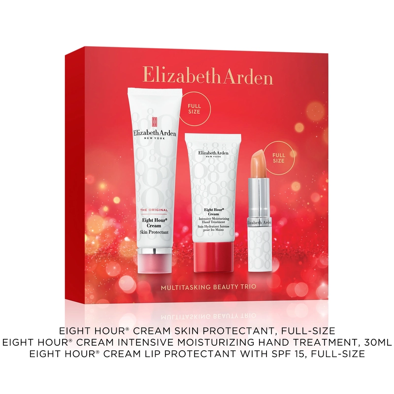 Elizabeth Arden Eight Hour Gift Set (Limited Edition) er et superdeilig sett. Skjem bort deg selv eller noen du er glad i med vårt Nourishing Skin Essentials gavesett. Settet inneholder tre av våre bestselgende Eight Hour-favoritter som gir næring, beskyttelse og fuktighet fra topp til tå. Disse produktene er perfekte for tørr vinterhud og hverdagsluksus. Settet inneholder: - 1 stk. Elizabeth Arden Eight Hour Cream Skin Protectant 50 ml - 1 stk. Elizabeth Arden Eight Hour Cream Lip Protectant Stick SPF 15 3,7 gr. - 1 stk. Elizabeth Arden Eight Hour Cream Intensiv Fuktighetsgivende Håndbehandling 30 ml