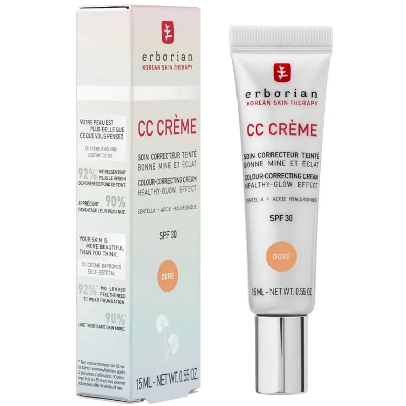 Erborian CC Creme Doré er en unik formel som inneholder innkapslede pigmenter som endrer farge ved kontakt med huden. Ved første øyekast ser kremen hvit ut, men etter påføring tilpasser den seg nøyaktig hudtonen din. Den jevner ut og forbedrer hudtonen og gir lett dekning med en naturlig finish. Den lette teksturen smelter inn i huden og etterlater en utrolig lett film på hudoverflaten som umiddelbart visker ut hudtekstur og mindre ujevnheter. CC Creme er beriket med et ekstrakt av Centella Asiatica - en aktiv ingrediens kjent for sine beroligende egenskaper. Den gir næring til huden din og fungerer som et daglig hudpleieprodukt, og gir også SPF 30-beskyttelse mot solens skadelige effekter. Perfekt for alle som leter etter et farget hudpleieprodukt som gir lett dekning for å jevne ut hudtonen og forbedre huden med en sunn glød, samtidig som det gir svært naturlige resultater. Den gjør at huden din ser glattere ut med en naturlig glød. Den perfekte kombinasjonen av hudpleie og sminke! Passer for alle hudtyper. Fordeler: - CC-krem - For solbrun og solbrun hud - SPF 30 - Unik formel - Tilpasser seg hudtonen - Jevner ut hudtonen - Lett dekkevne - Naturlig finish - Lett tekstur - Jevner ut hudteksturen - Beriket med Centella Asiatica - Beroligende - Lett dekkevne - Sunn glød - Naturlige resultater - Jevner ut hudens utseende - Naturlig glød - Passer for alle hudtyper - Unisex - Dermatologisk testet - Koreansk hudpleie Bruk: - Påfør i ansiktet enten etter eller i stedet for fuktighetskrem