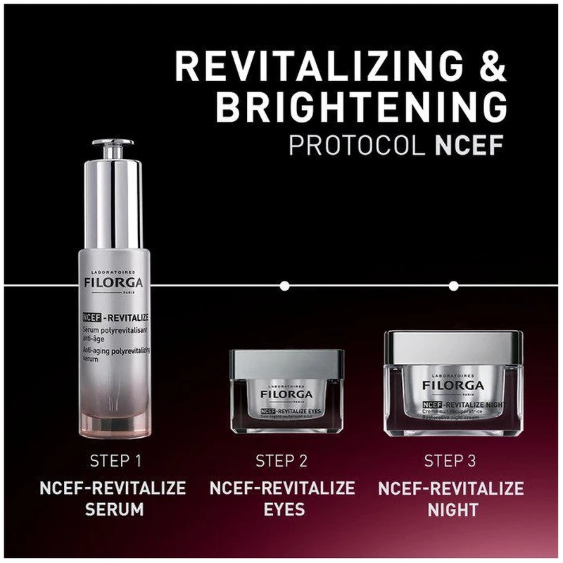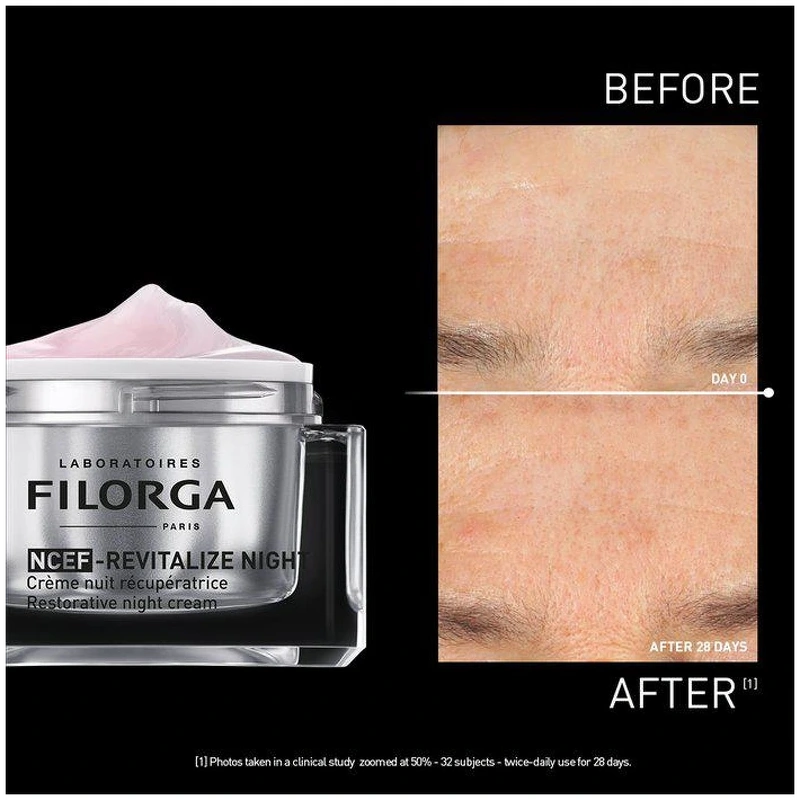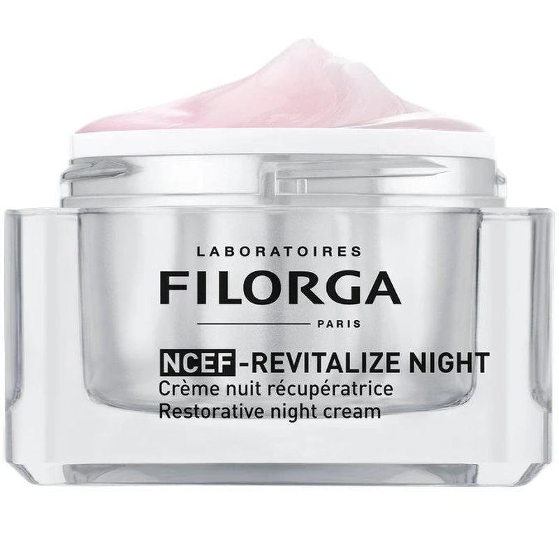 Filorga NCEF-Revitalize Night Cream er en nattkrem som gir glattere, mer strålende og revitalisert hud. Inspirert av revitaliserende injeksjoner innen estetisk medisin, virker denne anti-aldrings nattkremen i løpet av natten for å støtte hudens fornyelsesprosess og redusere tegn på tretthet, matt hud og ujevn hudtone. Formelen kombinerer en høy konsentrasjon av NCEF og et aktivt trippelkompleks: Antirynkepeptider (matriciner) styrker hudens naturlige reparasjonsmekanismer, mens Tephrosia purpurea (en erteplanteart) – kjent for sin evne til å regulere stressrelatert hormonell aktivitet – beskytter mot oksidativt stress og gir huden en fornyet glød. Niacinamid (2 %) bidrar til å redusere rødhet og aldersflekker, styrke hudbarrieren og jevne ut hudtonen. Den friske, omsluttende geltekstur absorberes raskt og gir komfort og fuktighet over natten. Passer for alle hudtyper. Klinisk bevist effekt: - Etter bare 7 dager var hudens glød økt med 17 % og hudtonen var 12 % jevnere.* - Etter 28 dager var gløden økt med 51 % og hudtonen var 42 % jevnere.* Klinisk evaluering - 32 kvinner - etter 7 dager med daglig bruk. Klinisk evaluering - 32 kvinner - etter 28 dager med daglig bruk. Fordeler: - Anti-aldrende nattkrem - Glatter ut og revitaliserer huden - Støtter hudfornyelse over natten - Reduserer tretthet, matt hud og ujevn hudtone - Inneholder høy konsentrasjon av NCEF - Trippelkompleks: antirynkepeptider, Tephrosia purpurea, niacinamid (2 %) - Beskytter mot oksidativt stress - Lysner pigmentering og styrker hudbarrieren - Raskt absorberende geltekstur - Passer for alle hudtyper Bruk:** - Påfør om kvelden på renset ansikt og hals - Masser forsiktig inn til kremen er fullstendig absorbert.