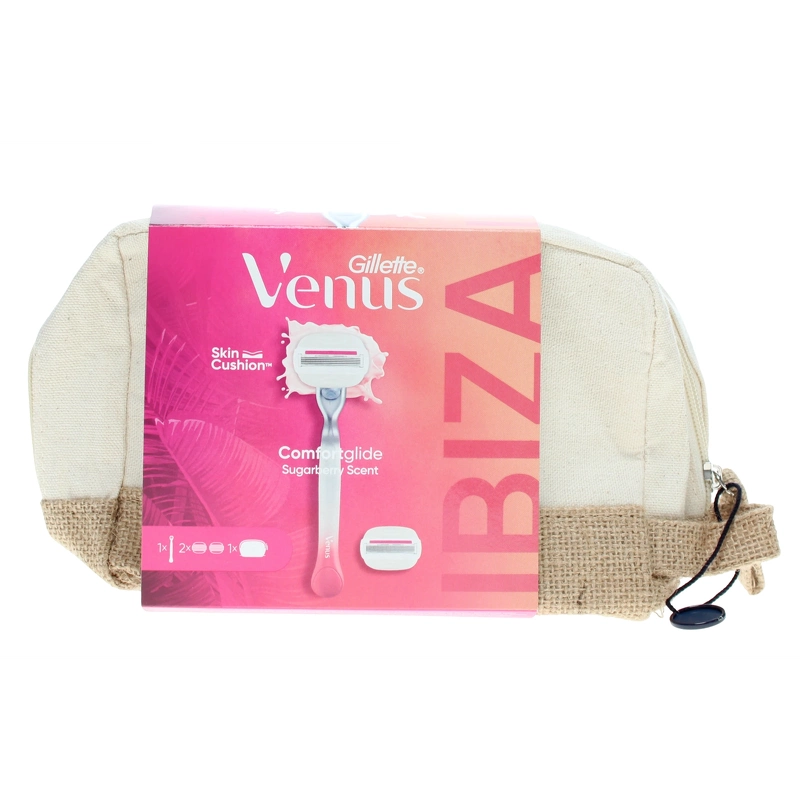 Gillette Venus ComfortGlide gavesett 4 deler gjør barberingen enkel og effektiv. Opplev en barbering som føles som en luksuriøs spa-opplevelse med Venus ComfortGlide Sugarberry – damehøvelen som kombinerer silkemyk komfort med presis effektivitet. De 5 skarpe, fleksible bladene gir en tett og glatt barbering som varer lenger, mens det bevegelige, avrundede barberhodet følger kroppens naturlige kurver og sikrer et perfekt resultat – uten anstrengelse. Den er utstyrt med to fuktighetsgivende gelbarer beriket med Olay-ingredienser og en lett duft av myk kokosnøtt og sukkerbær, som frigjør nærende fuktighet ved kontakt med vann. Resultatet er hud som føles utrolig glatt, myk og næret etter hver barbering. Settet inneholder: - 1 stk. Gillette Venus ComfortGlide barberhøvel - 2 stk. Gillette Venus ComfortGlide barberblad - 1 stk. toalettmappe