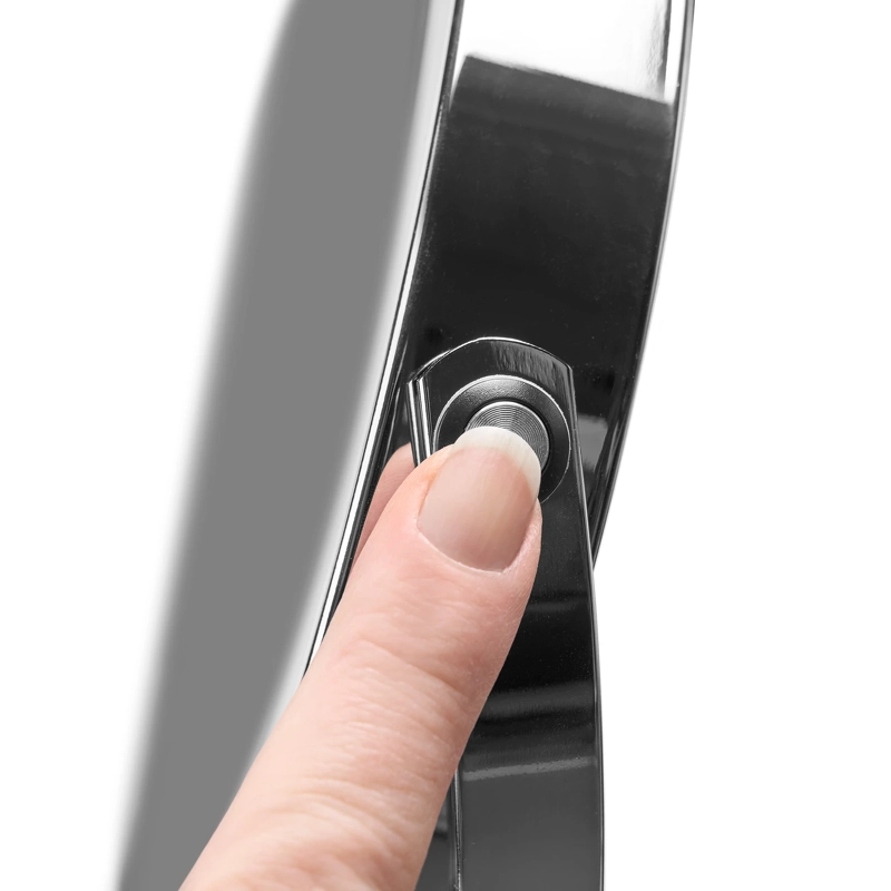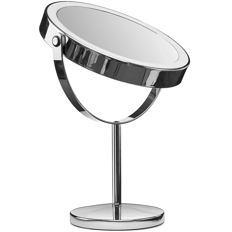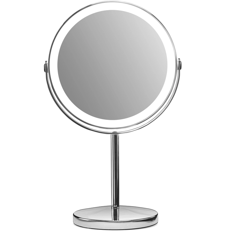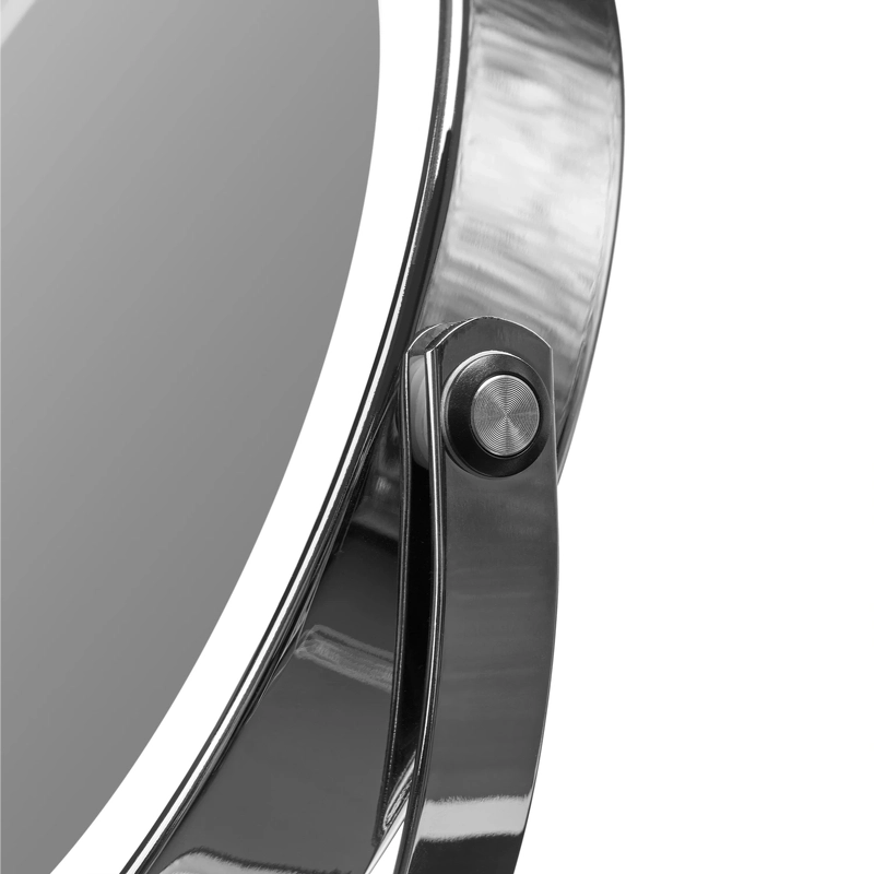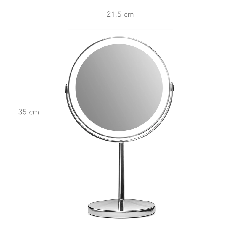 Gillian Jones oppladbart LED-bordspeil X1/X10 - Sølv 10218-81 er et smart, oppladbart bordspeil med lys. Det innebygde, kraftige LED-lyset har tre fargeinnstillinger - nøytralt, varmt og kaldt lys. Med berøringsknappen på siden kan du enkelt justere lysfargen, slå lyset av og på, og finjustere lysstyrken med dimmefunksjonen. Speilet kan lades fullt via USB-C - slik at du ikke trenger å bekymre deg for engangsbatterier. En full lading tar omtrent 200 minutter, og avhengig av valgt lysfarge kan speilet lyse mellom 150 og 240 minutter (kald hvit: 240 min, varm/gul: 240 min, naturlig: 150 min). Den medfølgende USB-C-kabelen gjør ladingen enkel og praktisk. Selve speilet er laget av ekte speilglass med en stor diameter på 17 cm og kan roteres fritt, slik at du enkelt kan bytte mellom 1x vanlig speilbilde og 10x forstørrelse for presist sminkearbeid eller for eksempel napping av øyenbryn. Detaljer: - Bordspeil med to sider - Ekte speilglass - Med 1x og 10x forstørrelse - Oppladbar - Full lading på ca. 200 minutter - Kraftig LED-lys - 3 fargeinnstillinger - nøytralt, varmt og kaldt lys - Justerbar lysstyrke - Multifunksjonsknapp på siden - USB-C-kabel inkludert - Mål: B: 21,5 cm H: 35 cm, D: 13,5 cm