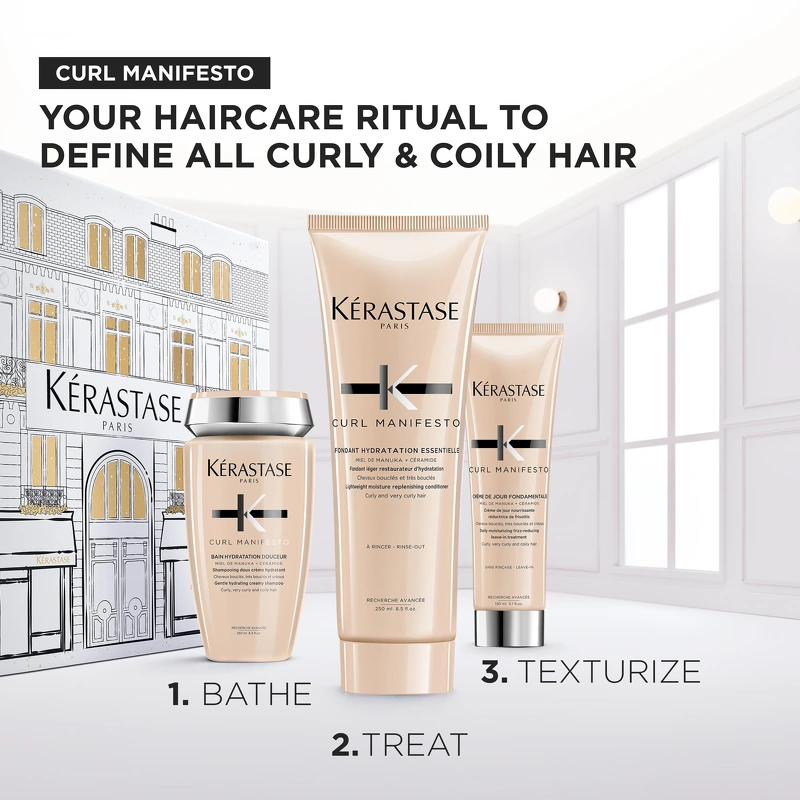 Kérastase Curl Manifesto Fondat Holidays Gift Set er en super eksklusiv gaveeske med Curl Manifesto, som er den ultimate profesjonelle pleien for alle krøller. Formulert med fuktighetsgivende Manuka-honning og styrkende ceramid, som sikrer den perfekte kombinasjonen av fuktighet, definisjon og styrke. Settet inneholder: - 1 stk. Kérastase Curl Manifesto Bain Hydration Douceur Shampoo 250 ml - 1 stk. Kérastase Curl Manifesto Fondant Hydration Essentielle Conditioner 250 ml - 1 stk. Kérastase Curl Manifesto Crème De Jour Fondamentale Leave-In 150 ml