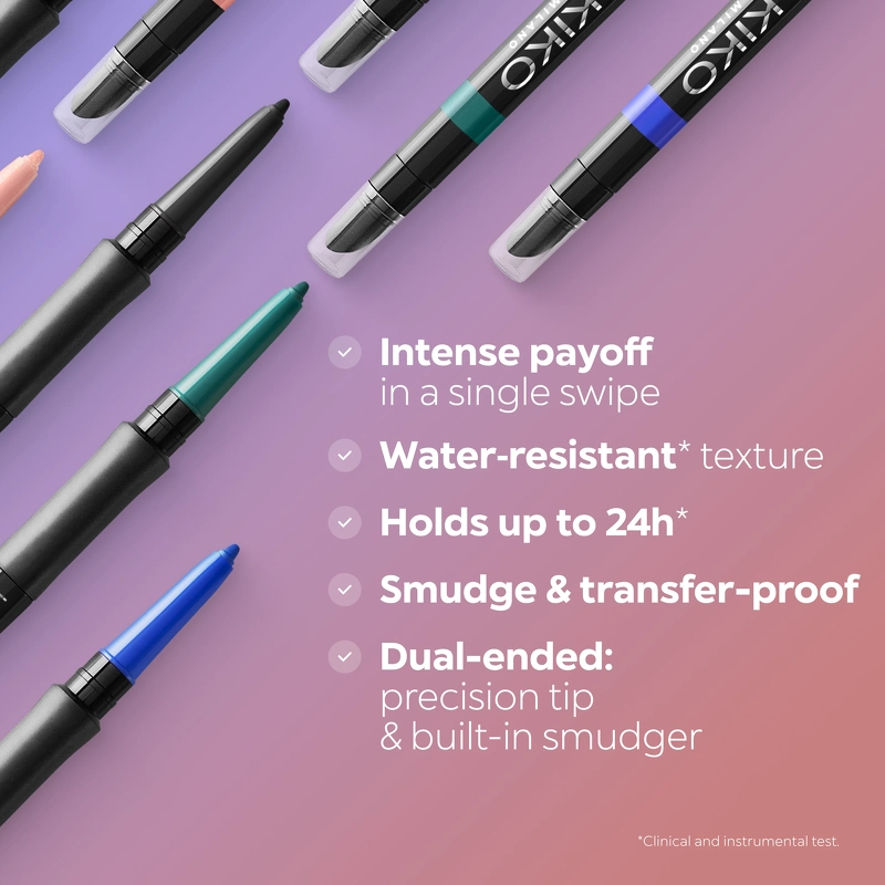 KIKO Milano Unlimited Precision Automatic Eyeliner & Khôl - 20 Pink Shell er en superlekker øyeblyant som kan brukes til den indre og ytre kanten av øyet. Den er ideell for å definere øyets form og fremhever øynene med presise og jevne strøk. Denne eyeliner og kohl gir intens og umiddelbar farge som varer opptil 24 timer. Den har en myk og kremaktig konsistens som glir godt, er motstandsdyktig mot både vann, svette og damp og ikke smitter av eller klatter. Blyanten er lett å blande og skarpe takket være den multifunksjonelle applikatoren integrert på baksiden. Den er også designet med et mykt, polstret bånd som gir et behagelig grep under bruk. Denne eyeliner & khôl lar deg skape et mylder av mulige utseende med et definert, fargerikt, livlig utseende og ubegrenset skjønnhet. Den er tilgjengelig i flere forskjellige farger med en matt eller perleskinnende finish. Klinisk og instrumentelt testet. Fordeler: - Eyeliner og eyeliner - For bruk på indre og ytre kant av øyet - Intens og umiddelbar farge - Varer i opptil 24 timer - Myk og kremet tekstur - Motstandsdyktig mot vann, svette og damp - Gnir ikke av eller sprer seg ut - Applikator for spissing og blanding - Mykt, polstret bånd sikrer godt grep under bruk - Oftalmologisk testet Påføring: - Påfør blyanten forsiktig på indre og ytre kant av øyet - Hvis du ønsker det at du kan blande linjen på ytterkanten av øyet med den integrerte applikatoren - Roter den fargede delen av blyanten for å skru spissen ytterligere ut - Slip blyanten med den multifunksjonelle applikatoren Ingredienser: TRIMETHYLSILOXYSILICATE, GLIMER, SYNTETISK VOKS, HYDROGENERT POLYISOBUTEN, HYDROGENERT POLY(C6-14 OLEFIN), HYDROGENERT POLYDECEN, POLYBUTEN, ETHYLEN/PROPYLEN COPOLYMER, COPERNICIA CERIFERA CERA (COPERNICIA CERIFERA ( CARNAUBA) VOKS/ CIRE DE CARNAU BA), DISTEARDIMONIUM HECTORIT, PROPYLENCARBONATE, PENTAERYTHRITYL TETRA-DI-T-BUTYL CIDRY IDE), CI 77491 (JERNOKSIDER ).