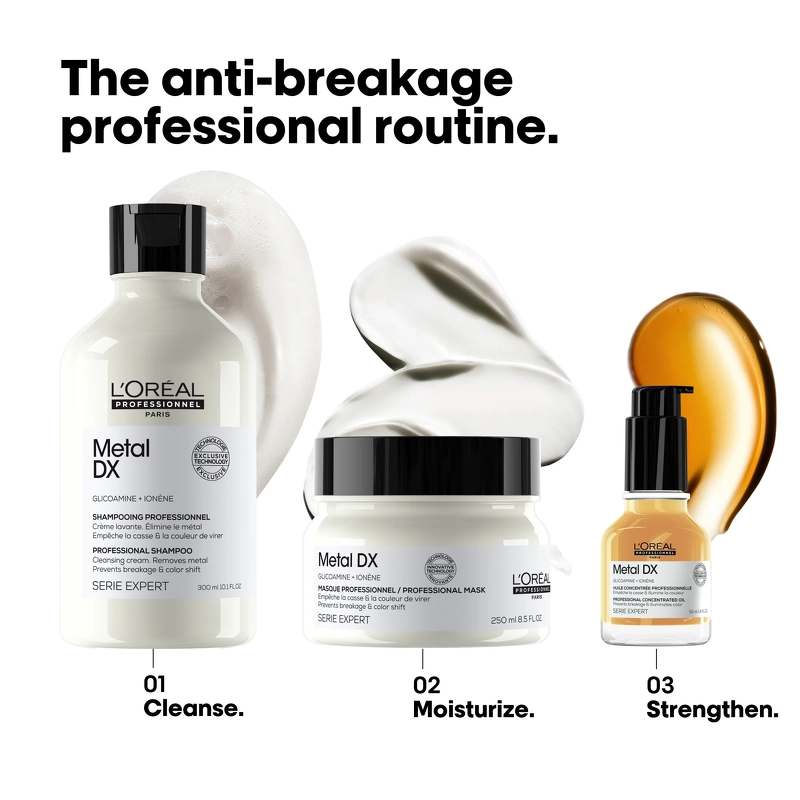 L'Oréal Professionnel Metal DX Anti-Deposit Protector Concentrated Oil er en effektiv hårolje. Vask etter vask trenger metallpartikler inn i håret. Metallpartikler øker risikoen for hårbrudd og fargeendring. Denne konsentrerte oljen er beriket med glikoamin og beskytter håret mot opphopning av metallpartikler. Håret blir umiddelbart sterkere og mer næret. Etter bare én bruk: 97 % mindre hårbrudd, 2 ganger mer næret hår. Håret får mer volum og disiplin. Den konsentrerte Metal DX-oljen er en del av Metal DX-serien, som fjerner metall fra håret for å forhindre hårbrudd og fargeendring. Instrumentaltest av Metal DX Concentrated Oil 8 timer etter påføring av produktet. Fordeler: - Hårolje - Motvirker metallpartikler - Styrker og gir næring - Reduserer brudd - Forbedrer fargens holdbarhet - Metal DX-serien Bruk: - Bruk daglig i tørt eller håndkletørket hår - Varm 1–2 pump i håndflaten - Fordel jevnt fra mellomlengdene til tuppene - Ikke skyll ut - La håret lufttørke eller tørk med en hårføner Ingrediensliste: "1258131 L - INGREDIENSER: ISODODECANE, AQUA / WATER / EAU, DIPROPYLENE GLYCOL, DIMETHICONE, ALCOHOL DENAT., DIMETHICONOL, GLYCERIN, PEG-14 DIMETHICONE, HYDROXYETHYL UREA, PHENOXYETHANOL, PEG-60 HYDROGENATED CASTOR OIL, LIMONENE, POLYACRYLAMIDE, C13-14 ISOPARAFFIN, PROPYLENE GLYCOL , HEKSYL CINNAMAL , LINALOOL , LAURETH-7 , KARAMELL , CITRAL , GLYCINE , GERANIOL , KUMARIN , CI 19140 / GUL 5 , POLYQUATERNIUM-7 , CI 15985 / GUL 6 , PENTAERYTHRITYL TETRA-DI-T-BUTYL HYDROXYHYDROCINNAMAT , NATRIUMBENZOAT , PARFYM / DUFT (FIL N295353/1). Produktets ingrediensliste kan bli oppdatert over tid. Sjekk alltid ingredienslisten som finnes på emballasjen til det kjøpte produktet.