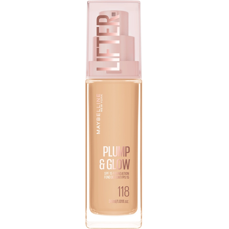 Maybelline Lifter Plump & Glow Foundation - 118 er en nærende foundation som gir deg strålende, frisk hud. Dette er mer enn bare sminke - formelen er beriket med 2 % niacinamid og hyaluronsyre, og har fuktighetsgivende og glødgivende egenskaper. Med sin 90 % hudpleiebase er denne foundationen laget for å synlig forbedre hudens tekstur og fuktighetsnivå umiddelbart, samt gi huden mer volum over tid og forsterke dens naturlige glød. Resultatet er frisk, strålende hud med en behagelig, medium dekning som ikke legger seg i linjer og rynker. Fordeler: - Foundation - Flytende - Medium dekning - Øyeblikkelig fuktighet - Forsterker hudens naturlige glød - Synlig forbedrer hudtekstur - Gir huden mer volum over tid - Legger seg ikke i linjer og rynker - For alle hudtyper - Passer for sensitiv hud - Ikke-komedogen formel, tetter ikke porene - Kosmetoklinisk testet for bevist effekt Bruk: - Påfør på renset ansikt, etter fuktighetskrem. For lengre holdbarhet, påfør først en primer - Rist produktet godt før hver bruk - Pump 1–2 doser foundation på håndbaken eller direkte i ansiktet - Bland inn i huden med fingertuppene, en sminkekost eller en sminkesvamp for jevn dekning - For mer dekning, påfør mer foundation på ønskede områder til du oppnår ditt perfekte utseende