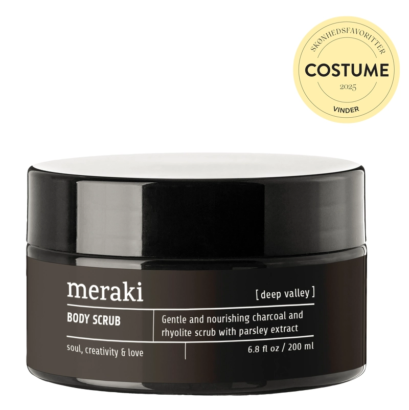 Meraki Body Scrub - Deep Valley er en super deilig kroppsskrubb som utstråler enkelhet og ro, og forvandler badet ditt til et avslappende ritual. Den fine teksturen med ryolittkorn og kull eksfolierer huden din skånsomt og effektivt og gir en myk følelse som du tydelig kan føle, mens formelen med persilleekstrakt også har en nærende effekt. Frisk bergamott og appelsin møter kjølige noter av eukalyptus og mynte, mens varme undertoner av sedertre og sandeltre runder av opplevelsen. Denne kroppsskrubben er fylt i en enkel krukke i grå, skandinavisk stil, som vil passe inn i ethvert bad. Nyt et øyeblikk av velvære på badet, eller bruk skrubben som en del av kveldsrutinen din. Unn deg selv en pause - din hverdagsluksus starter her. Fordeler: - Kroppskrubb - Mild og effektiv peeling - Gjør huden herlig myk - Pleiende formel - For alle hudtyper - Frisk sitrus- og mynteduft - Grått design i skandinavisk stil - Ingredienser med 95 % naturlig opprinnelse Bruk: - Bruk på fuktet hud i dusjen - Masser en passende mengde inn i huden med sirkelbevegelser - Skyll grundig - Avslutt med en bodylotion eller melk for å tilføre huden ekstra fuktighet - Bruk 1-2 ganger i uken Ingrediensliste: Aqua, Aloe Barbadensis Leaf Juice, Sodium Laureth Sulfate, Glycerin, Pimpstein, Trekullpulver, Acrylates/C10-30 Alkyl Acrylate Crosspolymer, Sodium Cocoamphoacetate, Phenoxyethanol, Citric Acid, Sodium Hydroxide, PEG-4 Rapeseedamide, Sodium Benzoate, Sodium Chloride, Potassium Sorbate, Sodium Gluconate, Daucus Carota Sativa Root Extract, Carum Petroselinum Extract, Parfum, Limonene, Citrus Aurantium Bergamia-skallolje, linalool, ekspresset Citrus Aurantium Dulcis-skallolje, eukalyptusbladolje, linalylacetat, sitronellol, D-alfa-pinen, juniperus virginiana-olje. 95 % naturlig opprinnelse av totalmengden. 10 % av de totale ingrediensene er fra økologisk landbruk.