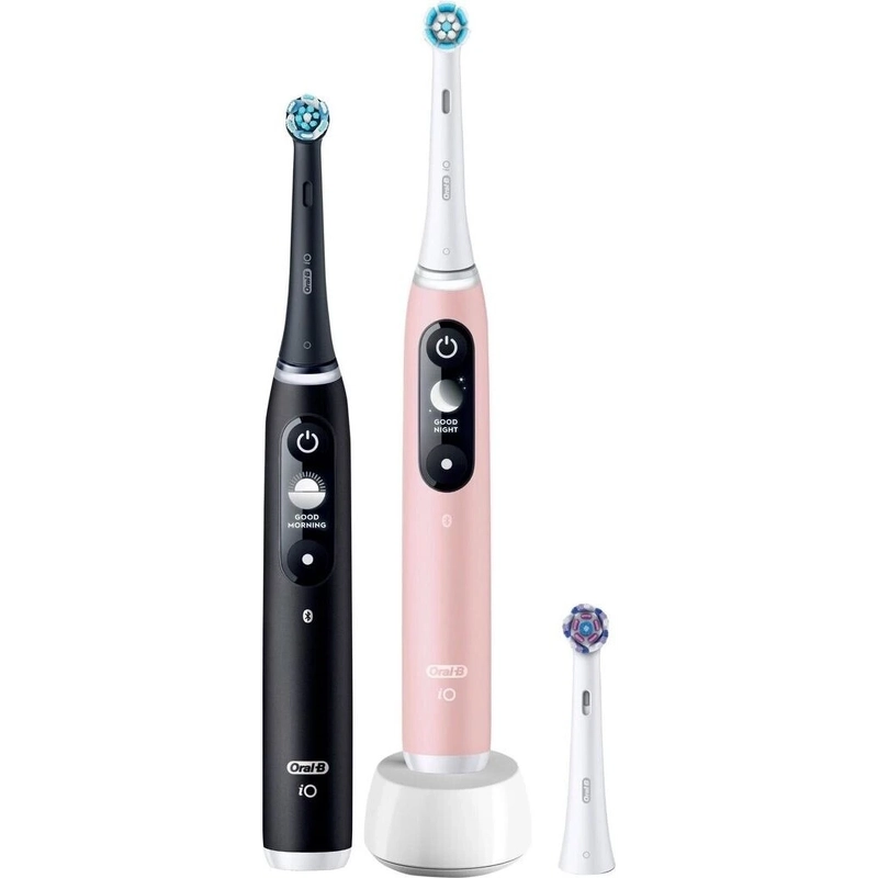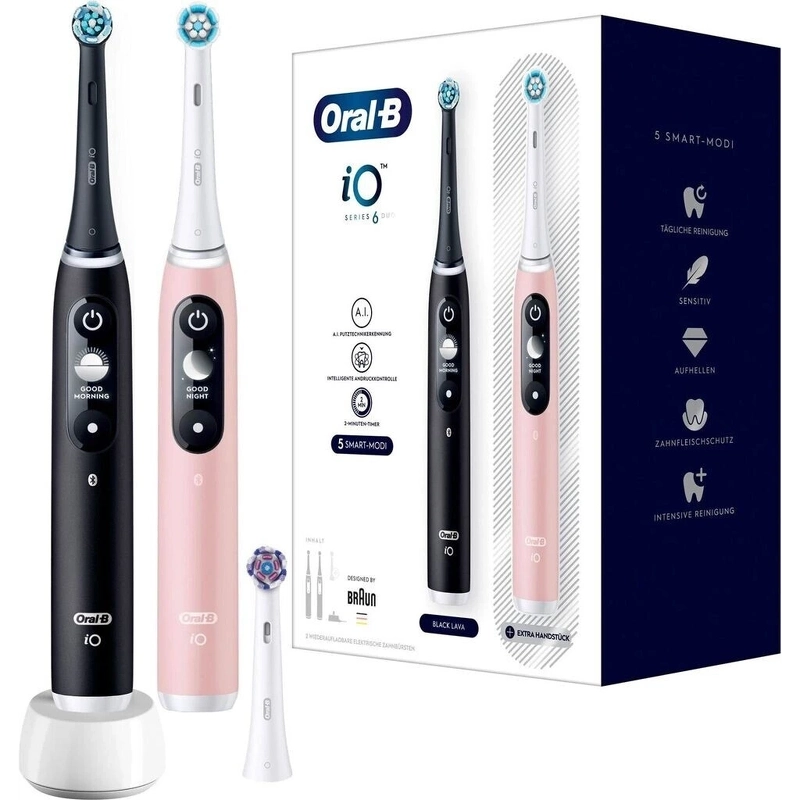 Oral-B iO Series 6 Duo Pack – Black Lava + Pink Sand er en duopakke med to supereffektive elektriske tannbørster. Opplev fremtiden for munnpleie med Oral-B iO Series 6 – den elektriske tannbørsten som kombinerer intelligent teknologi, presisjon og komfort for en profesjonell ren følelse hver dag. Det tannlegeinspirerte runde børstehodet fungerer sammen med mikrovibrasjoner, som skånsomt, men effektivt fjerner plakk og gir en jevn, frisk og sunn munnfølelse. Den smarte trykksensoren veileder deg i sanntid, slik at du verken pusser for hardt eller for mykt – og dermed beskytter tannkjøttet optimalt. Takket være kunstig intelligens lærer børsten bevegelsene dine og hjelper deg med å forbedre pusseteknikken din dag for dag, slik at du alltid får best mulig renhet. Med sitt elegante design, stille motor og avanserte iO-teknologi leverer Oral-B iO Series 6 en tannpuss som ikke bare føles annerledes – den forvandler hele pusseopplevelsen din. Settet inneholder: - 1 stk. Oral-B iO Series 6 – Black Lava - 1 stk. Oral-B iO Series 6 – Pink Sand