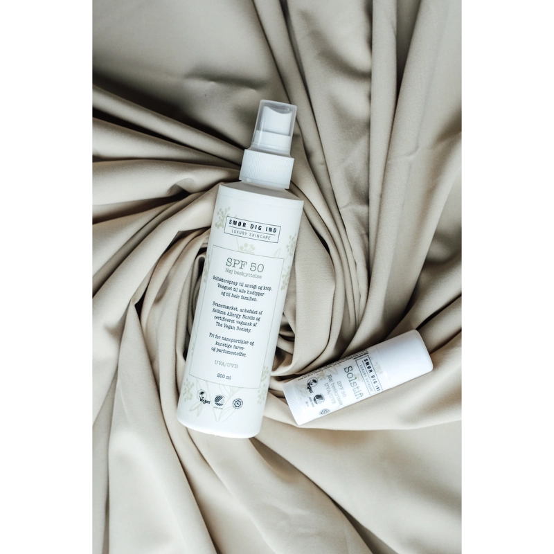Smør Dig Ind solkremspray SPF 50 er en eksklusiv og hypoallergen solspray utviklet med hensyn til både miljøet og sensitiv hud. Med bredspektret UVA- og UVB-beskyttelse og lindrende aloe vera, gir denne lette, hurtigabsorberende sprayen næring til huden, mens vitamin E styrker og beskytter med kraftig antioksidantvirkning. Denne milde formelen er spesielt egnet for barn og de med sensitiv eller solintolerant hud. Sprayen er ikke fet, ikke-klebrig og varer både til strandturer og sportsaktiviteter med sin vann- og svettebestandige formel. Smør Dig Ind solkremspray er svanemerket og anbefalt av Asthma-Allergy Nordic – din garanti for et trygt, hudvennlig og miljøbevisst valg. Fordeler: - Solkremspray - SPF 50 - UVA- og UVB-beskyttelse - Passer for sensitiv og solintolerant hud - Spesielt god for barn - Lett og hurtigtørkende konsistens - Ikke klissete eller fet - Vann- og svettebestandig - Med beroligende aloe vera - Inneholder vitamin E med antioksidanteffekt - Hypoallergenisk formel - Svanemerket og miljøtestet - Anbefalt av Asthma-Allergy Nordic Bruk: - Rist før bruk - Ikke spray direkte i ansiktet, men først på hendene - Spray direkte på kroppen og fordel forsiktig med hendene - Påfør 20 min. før man blir i solen. La solsprayen absorberes helt før du tar på deg klær, da solsprayen kan sette flekker på tekstiler. Gjenta påføringen ofte – spesielt hvis du svetter og etter at du har badet, slik at du er best mulig beskyttet til enhver tid. Ingrediensliste: Vann, Aloe Barbadensis-bladekstrakt, dibutyladipat, dietylaminohydroksybenzoylheksylbenzoat, C12-15 alkylbenzoat, etylheksyltriazon, bis-etylheksyloksyfenolmetoksyfenyltriazin, dietylheksylbutamidotriazon, glyserin, hydrogenert dimer, dilinoleyl/dimetylkarbonat-kopolymer, mikrokrystallinsk cellulose, akrylater/C12-22 alkylmetakrylat-kopolymer, dinatriumcetearylsulfosuksinat, natriumlevulinat, cellulosegummi, tokoferol, arginin, polyglyceryl-2-dipolyhydroksystearat, laurylglukosid, kokoglukosid, xantangummi, dinatriumlauryl Sulfosuccinat, sitronsyre, sorbinsyre, fenoksyetanol, kaliumsorbat
