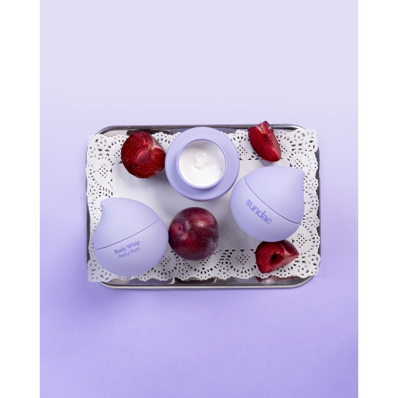 Sundae Body Whipped Body Moisturiser er en kremet bodylotion som smelter inn og forvandler tørr hud til silkemyk perfeksjon. Den fløyelsmyke, kremete formelen er beriket med vegansk rismelk og eksklusive australske botaniske ingredienser, som gir intens, langvarig fuktighet og forsterker hudens naturlige glød. Med denne kremen vil huden din føles smidig, fuktet og uimotståelig glatt – hver eneste dag. Som en ekstra bonus har denne bodylotionen en lett og søt duft av solmodne plommer. Fordeler: - Bodylotion - Søt plommeduft - Gir intens og langvarig fuktighet - Etterlater huden myk, glatt og fyldig - Beriket med vegansk rismelk - Med australske botaniske ingredienser - Passer for daglig bruk Bruk: - Ta en generøs mengde og masser inn i huden – gi tørre områder den strålende fuktigheten de ønsker – Skjem deg bort med Body Whip etter et bad med et valgfritt Sundae dusjskum for å holde på fuktigheten og etterlate huden silkemyk og uimotståelig