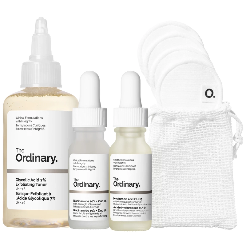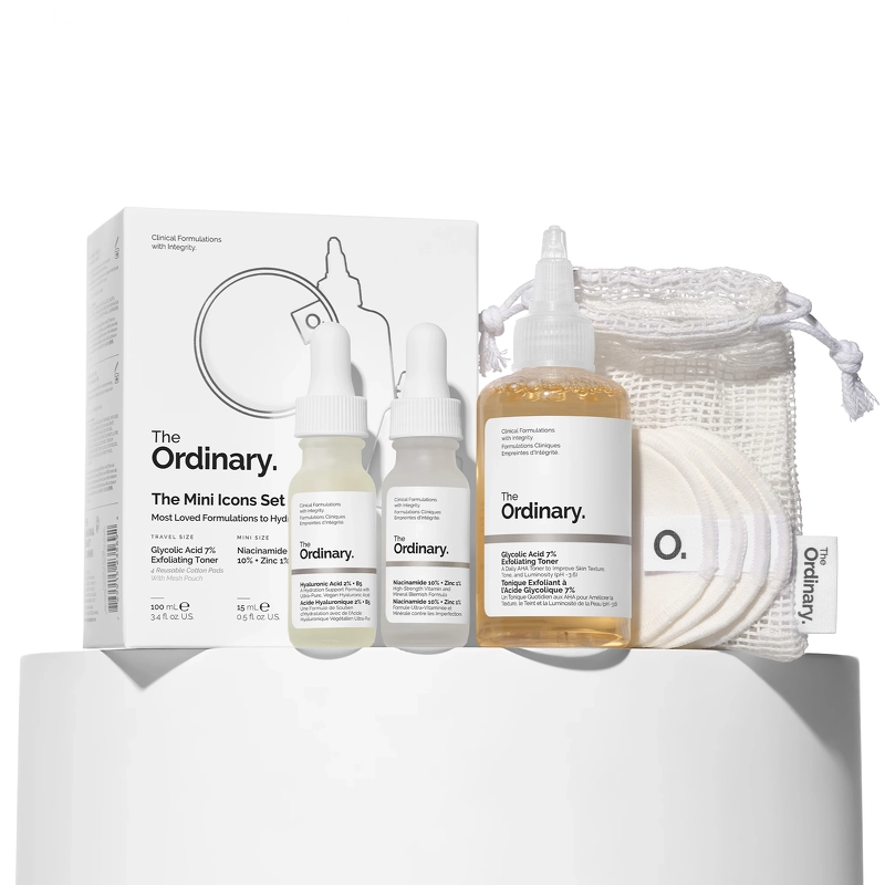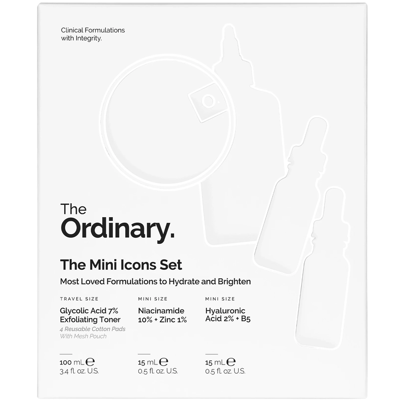 The Ordinary The Mini Icons gavesett (begrenset opplag) inneholder tre miniatyrstørrelser av noen av våre mest elskede formler, ideelle for reiser, samt gjenbrukbare bomullspads for å hjelpe med påføring av Glycolic Acid 7% Exfoliating Toner. Glycolic Acid 7% Exfoliating Toner er en vannbasert, eksfolierende toner formulert med 7 % glykolsyre, en dokumentert alfahydroksysyre (AHA) som effektivt eksfolierer huden. Daglig overflateeksfoliering bidrar til å fjerne døde hudceller for å glatte ut hudtekstur og jevne ut tonen. Niacinamid 10 % + Zinc 1 % er et universalserum som balanserer overflødig olje for å forhindre synligheten av urenheter. Niacinamid 10 % + Zinc 1 % inneholder en høy konsentrasjon av niacinamid, støttet av supplerende sink PCA, som gir bedre penetrasjon av denne multifunksjonelle ingrediensen. Hyaluronic Acid 2 % + B5 er et lett hyaluronsyreserum som kombinerer fem former for hyaluronsyre for å gi umiddelbar, rik fuktighet samtidig som det glatter ut teksturen. Ytterligere støttende ingredienser ceramider og provitamin B5 bidrar til å gjenopprette fuktighetsbarrieren for å holde på fuktigheten. For å bruke formelen sammen i en rutine, mett en bomullsdott med Glycolic Acid 7% Exfoliating Toner etter rens og påfør på ansikt og hals. Påfør Glycolic Acid 7% Exfoliating Toner én gang daglig, helst om kvelden. Etter rens og toning, påfør noen dråper Niacinamide 10% + Sink 1%, og når det er tørt, følg opp med noen dråper Hyaluronic Acid 2% + B5. Settet inneholder: - 1 stk. The Ordinary Glycolic Acid 7% Exfoliating Toner 100 ml - 1 stk. The Ordinary Niacinamide 10% + Sink 1% - 15 ml - 1 stk. The Ordinary Hyaluronic Acid 2% + B5 - 15 ml