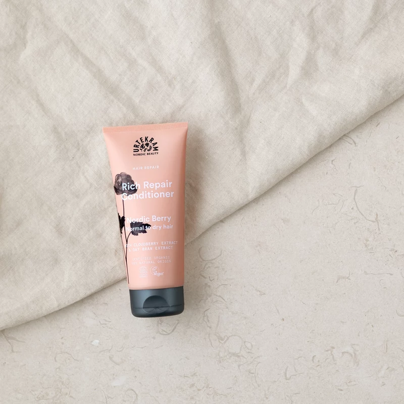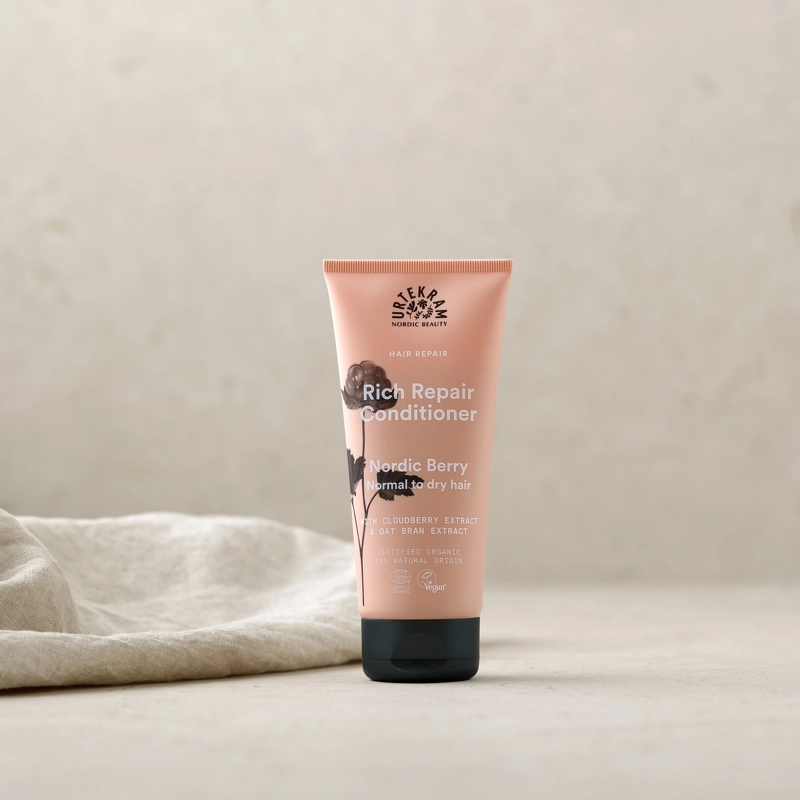 Urtekram Nordic Berry Rich Repair Conditioner er en reparerende balsam for normalt til tørt hår, men er også egnet for skadet og skadet hår. Formelen er beriket med multebærekstrakt, som bidrar til å gi næring, beskytte og friske opp håret. Den inneholder også pleiende havreolje, havrekliekstrakt og aloe vera, som bidrar til å beskytte og gi næring til håret, støtte dets naturlige styrke, glans og mykhet og gjøre det lettere å løse opp floker. Denne balsamen har en fruktig og frisk duft, og er sertifisert av Ecocert Cosmos Organic, vegansk og basert på ingredienser med 99 % naturlig opprinnelse, og inneholder ikke silikon, mineralolje eller syntetiske fargestoffer. Fordeler: - Balsam - For normalt til tørt hår - Også egnet for skadet og skadet hår - Reparerende - Gir næring, beskytter og frisker opp håret - Øker hårets styrke, glans og mykhet - Gjør håret lettere å gre - Fruktig, frisk duft - Ecocert Cosmos Organic-sertifisert - 99 % naturlig opprinnelse - Uten silikon, mineralolje eller syntetiske fargestoffer - Vegansk Påføring. - Masseres inn i nyvasket, fuktig hår - La virke i 2–3 minutter - Skyll ut Ingrediensliste: Aqua, Aloe Barbadensis Leaf Extract, Glycerin, Distearoylethyl Dimonium Chloride, Cetearyl Alcohol, Cocos Nucifera Oil*, Rubus Chamaemorus Fruit Extract, Magnolia Officinalis Bark Extract, Avena Sativa Bran Extract, Beta-Sitosterol, Avena Sativa Kernel Oil, Squalene, Glyceryl Stearate SE, Tocopherol, Sodium Hydroxide, Glyceryl Caprylate, Parfyme. 17 % økologisk av totalt. 64 % økologisk av totalt minus vann og mineraler. 99 % naturlig opprinnelse av totalt.